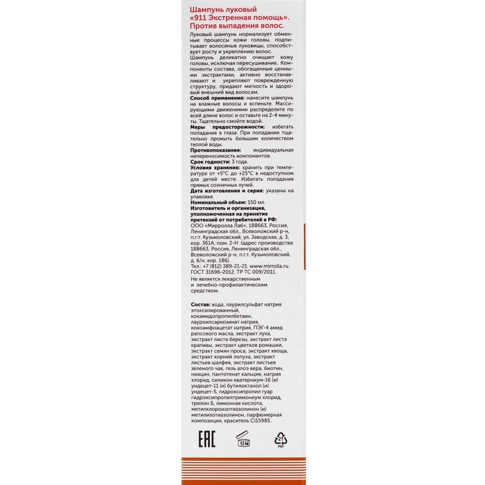 Шампунь 911 «Луковый» от выпадения волос и облысения, 150 мл