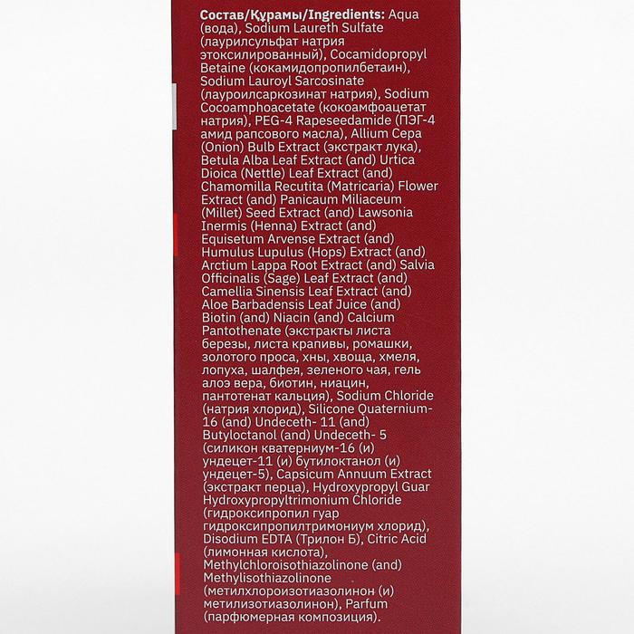 Состав: вода, лаурилсульфат натрия этоксилированный, кокамидопропилбетаин, лауроилсаркозинат натрия, кокоамфоацетат натрия, ПЭГ-4 амид рапсового масла, экстракт лука, экстракт листа березы, экстракт листа крапивы, экстракт цветков ромашки, экстракт семян проса, экстракт хвоща, экстракт корней лопуха, экстракт листьев шалфея, экстракт листьев зеленого чая, гель алоэ вера, биотин, ниацин, пантотенат кальция, натрия хлорид, силикон кватерниум-16 (и) ундецет-11 (и) бутилоктанол (и) ундецет-5, экстракт красного перца, гидроксипропил гуар гидроксипропилтримониум хлорид, трилон Б, лимонная кислота, метилхлороизотиазолинон (и) метилизотиазолинон, парфюмерная композиция, краситель Cl15985.