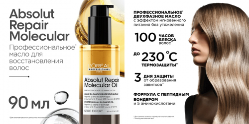 Профессиональное* двухфазное масло для волос Absolut Repair Molecular. Это инновационное масло, разработанное экспертами L'Oréal, использует запатентованную двухфазную технологию для обеспечения мгновенного питания** и интенсивного восстановления волос без эффекта утяжеления.*** Обогащенное Пептидным бондером и комплексом из 5 незаменимых аминокислот, средство объединяет водную и масляную фазы, даря волосам блеск до 100 часов** и сияние. Водная фаза проникает в волокно волоса, восстанавливая его макро-молекулярную структуру, в то время как масляная фаза создает защитный барьер на поверхности волоса, придавая волосам блеск, мягкость и здоровый вид.
