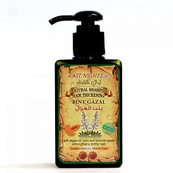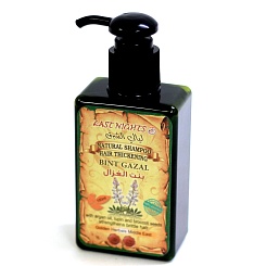 Состав натурального растительного шампуня BINT GAZAL «Газель» Национального сирийского производства восточной косметики East Nights идеально подойдет для восстановления сильно поврежденных волос, склонных к ломкости. Комплексно влияет на луковицы волос и на их структуру, восстанавливая и обеспечивая необходимым питанием. Пробуждает замершие луковицы к росту. Запускает процессы обновления волосяного покрова. Выравнивает толщину волос по структуре, делая их более плотными и крепкими. При регулярном курсовом применении существенно повышает густоту волос.