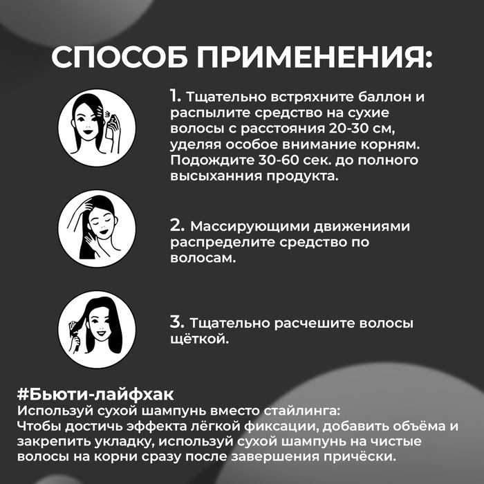 Сухой шампунь полностью вычесывается, не оставляет белых следов на одежде и волосах. После его применения прическа сохраняет свежесть и объем до 24 часов. Шампунь сухой обладает легким стайлинг эффектом и помогает увеличить объем чистых или не совсем свежих волос и облегчить процесс ежедневной укладки, делая локоны мягкими и послушными.