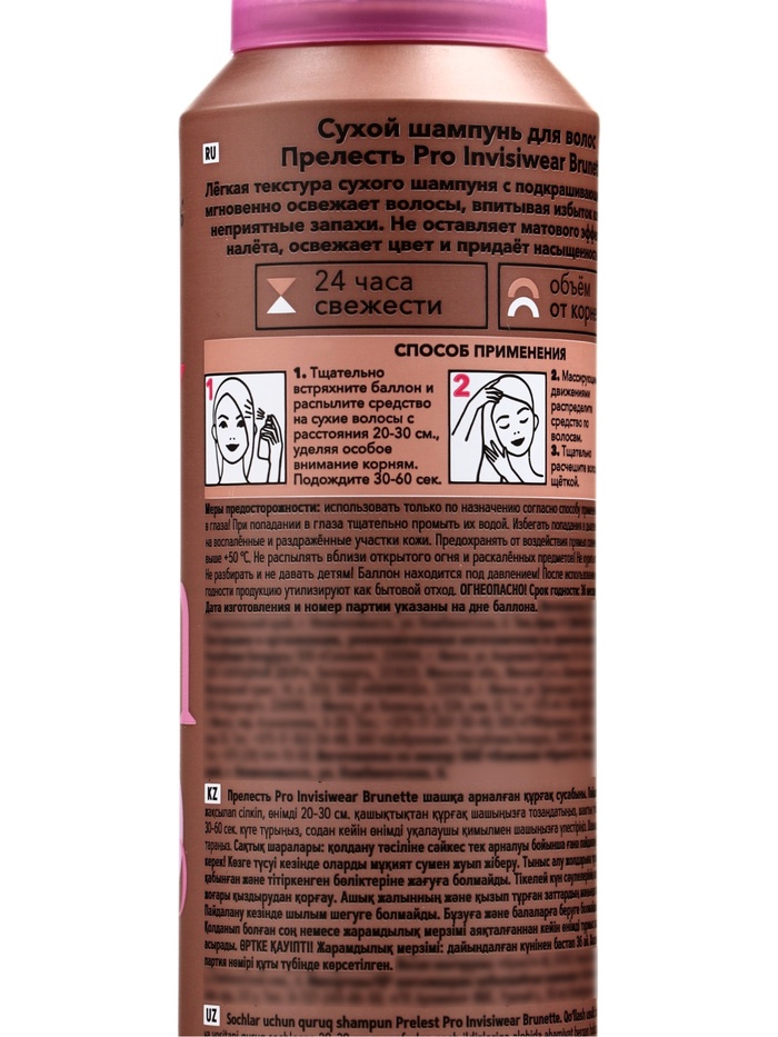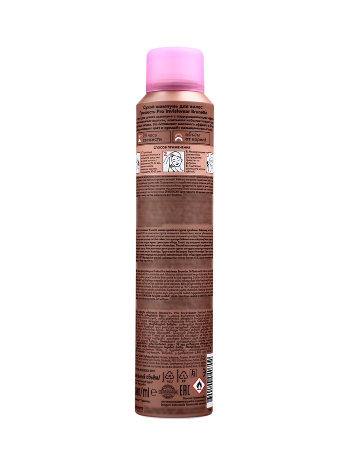 Сухой шампунь для шатенок и брюнеток Прелесть Professional Invisiwear, Объем и сияние, с подкрашивающим эффектом абсорбирует жирный блеск волос и головы, делает локоны объемнее, помогает подкрасить корни волос и поддерживать их цвет между окрашиваниями.