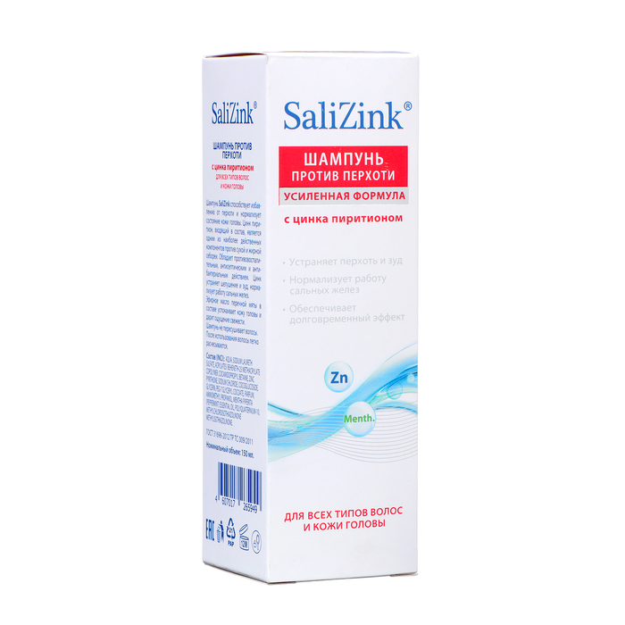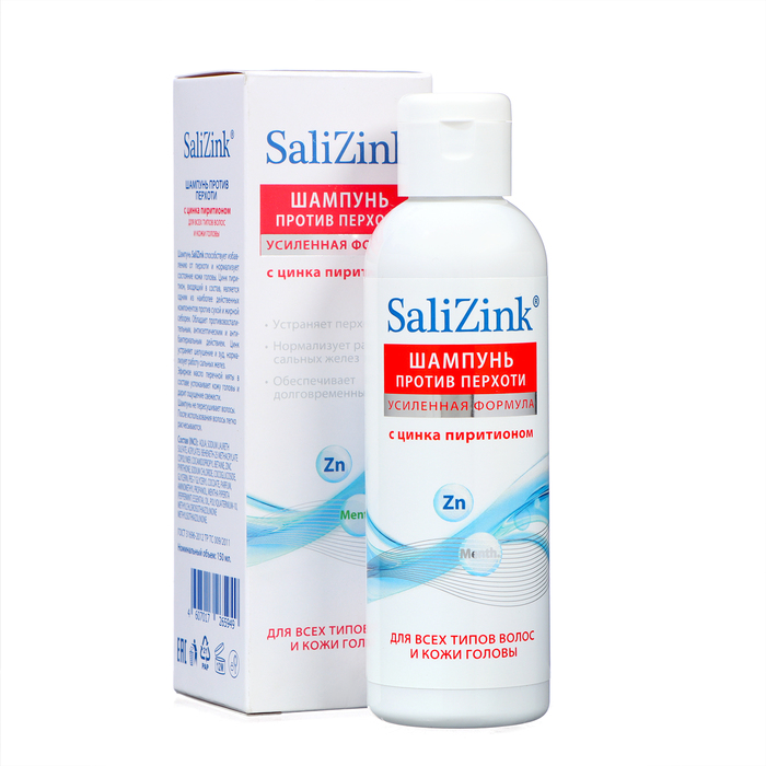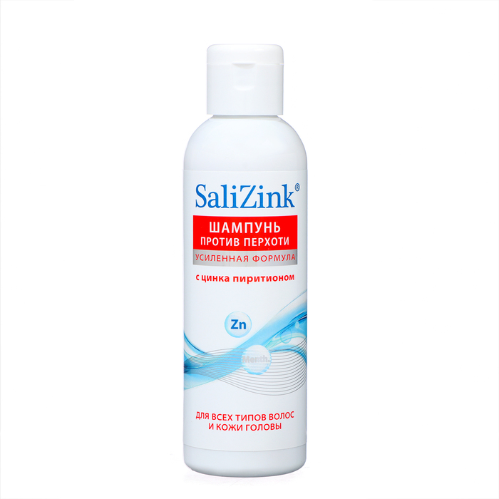 Шампунь SaliZink способствует избавлению от перхоти и нормализует состояние кожи головы. Цинк пиритион, входящий в состав, является одним из наиболее действенных компонентов против сухой и жирной себореи. Обладает противовоспалительным, антисептическим и антибактериальным действием. Цинк устраняет шелушение и зуд, нормализует работу сальных желез. Эфирное масло перечной мяты в составе успокаивает кожу головы и дарит ощущение свежести. Шампунь не пересушивает волосы. После использования волосы легко расчесываются.