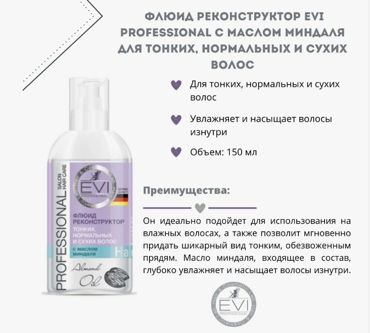 Флюид от бренда EVI Professional — универсальный «инструмент» в вашем арсенале красоты! Он идеально подойдет для использования на влажных волосах, а также позволит мгновенно придать шикарный вид тонким, обезвоженным прядям. Активная формула косметического продукта работает на восстановление структуры хрупких, поврежденных волос. При регулярном использовании восстанавливается повреждённая структура волос, утратившая свою природную красоту после применения горячих укладочных инструментов. Масло миндаля, входящее в состав, глубоко увлажняет и насыщает волосы изнутри.