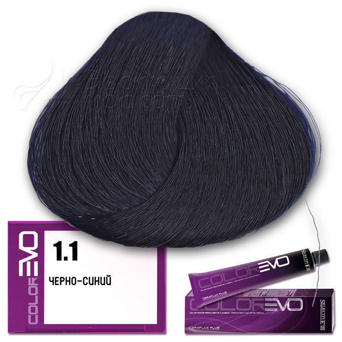 Selective Крем-краска для волос Colorevo  (Selective Professional) . Тон 1.1 - черно-синий. Серия пепельная. Объем: 100 мл Перманентная краска для волос с интенсивным покрывающим эффектом, идеальна для окрашивания волос со 100% сединой. Тона крем-краски Colorevo можно смешивать с корректорами Colorevo Mix, а также между собой, получая разную гамму цветов для реализации любого желания клиента. Краска проста в подготовке и, благодаря кремообразной консистенции, равномерно распределяется по волосам, плотно покрывая их.       КОРРЕКТОРЫ   7 корректоров: нейтральный, корректор осветления, синий, пепельный интенсивный, желтый, красный интенсивный, фиолетовый интенсивный. Colorevo Mix - это чистые тона, позволяющие устранить ненужные оттенки или создать бесконечные цветовые вариации.       АКТИВНЫЕ КОМПОНЕНТЫ CERAFLUX PLUS Color Diffusion System - инновационные керамиды. Система Ceraflux Plus позволяет красителю восстанавливать волосы одновременно с окрашиванием, ламинировать и защищать, долго сохранять цвет и делать его устойчивым. Фитостеролы - активные вещества растительного происхождения - увлажняют, кондиционируют и защищают волосы. Сбалансированные эмульгаторы и регуляторы консистенции - обеспечивают одинаковую вязкость, устойчивость к изменениям окружающей среды. Увлажняющий компонент - для наилучшей адгезии (прилипания) к волосам. Хелатирующий агент - для нейтрализации металлических примесей, которые могут помешать при проявлении цвета. Антиоксиданты - сохраняют неизменным продукт с течением времени. Приятный цветочный аромат. Контролируемый уровень аммиака - минимальное количество для максимального результата.     КАК ПРИМЕНЯТЬ?   Крем-краска Colorevo смешивается с окислительной эмульсией Colorevo Oxy (3%, 6%, 9%, 12%) в пропорции 1:1 (например, 100 мл Colorevo + 100 мл Colorevo Oxy 3-6-9%). Наносится на сухие, немытые волосы. Время выдержки 30 минут.   ColorEVO Blond - суперосветляющая серия, которая работает на натуральной базе и способна осветлить волосы на 4-5 тонов. При использовании суперосветляющей серии пропорция смешивания крем-краски Colorevo с окислительной эмульсией Colorevo Oxy составляет 1:2 (100 мл Colorevo + 200 мл Colorevo Oxy 12%). Время выдержки 45 минут.   Colorevo Mix (корректоры) - добавляются в краску в количестве, необходимом для выбранного нюанса. Чем светлее тон, тем меньше требуется Colorevo Mix, за исключением Colorevo Blond. Для тонов 9-10 уровня рекомендуется добавить не более 5% от общего количества крем-краски, в то время как для более темных нюансов следует использовать больше корректора. В любом случае, количество добавляемого Colorevo Mix не должно превышать 30%. Затем смешивается общее количество крема в пропорции 1:1 (Colorevo + Colorevo Oxy) или 1:2 (Colorevo Blond + Colorevo Oxy 12%).     КСТАТИ...   CERAFLUX PLUS - это биоидентичный концентрат липидов. Его состав повторяет состав липидов, обычно присутствующих в кутикуле волос. Только биоидентичный комплекс позволяет вносить активные компоненты в нужном качестве и количестве, чтобы создать идеальный косметический эффект.       ПРЕИМУЩЕСТВА   Запатентованная новая технология CERAFLUX PLUS Color Diffusion System - биоидентичный концентрат липидов. Максимально широкий выбор оттенков (более 170 оттенков). Сохранение цвета в течение длительного времени. Крем-краска с питательными и ухаживающими компонентами. Волосы более плотные и послушные при последующей обработке. Безопасный продукт без риска для здоровья. Сертифицированная система управлен