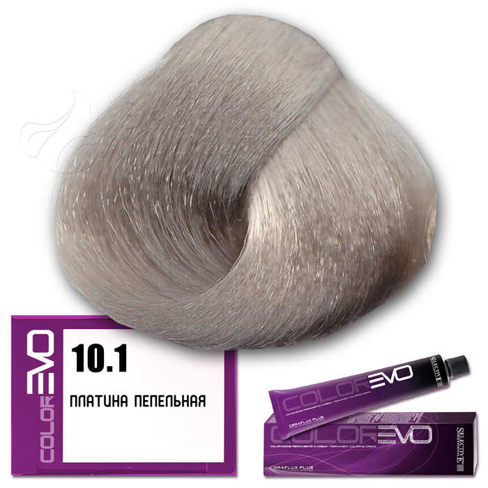 Selective Крем-краска для волос Colorevo  (Selective Professional) . 10.1 - платина пепельная.   Серия пепельная. Объем: 100 мл Перманентная краска для волос с интенсивным покрывающим эффектом, идеальна для окрашивания волос со 100% сединой. Тона крем-краски Colorevo можно смешивать с корректорами Colorevo Mix, а также между собой, получая разную гамму цветов для реализации любого желания клиента. Краска проста в подготовке и, благодаря кремообразной консистенции, равномерно распределяется по волосам, плотно покрывая их.       КОРРЕКТОРЫ   7 корректоров: нейтральный, корректор осветления, синий, пепельный интенсивный, желтый, красный интенсивный, фиолетовый интенсивный. Colorevo Mix - это чистые тона, позволяющие устранить ненужные оттенки или создать бесконечные цветовые вариации.       АКТИВНЫЕ КОМПОНЕНТЫ CERAFLUX PLUS Color Diffusion System - инновационные керамиды. Система Ceraflux Plus позволяет красителю восстанавливать волосы одновременно с окрашиванием, ламинировать и защищать, долго сохранять цвет и делать его устойчивым. Фитостеролы - активные вещества растительного происхождения - увлажняют, кондиционируют и защищают волосы. Сбалансированные эмульгаторы и регуляторы консистенции - обеспечивают одинаковую вязкость, устойчивость к изменениям окружающей среды. Увлажняющий компонент - для наилучшей адгезии (прилипания) к волосам. Хелатирующий агент - для нейтрализации металлических примесей, которые могут помешать при проявлении цвета. Антиоксиданты - сохраняют неизменным продукт с течением времени. Приятный цветочный аромат. Контролируемый уровень аммиака - минимальное количество для максимального результата.     КАК ПРИМЕНЯТЬ?   Крем-краска Colorevo смешивается с окислительной эмульсией Colorevo Oxy (3%, 6%, 9%, 12%) в пропорции 1:1 (например, 100 мл Colorevo + 100 мл Colorevo Oxy 3-6-9%). Наносится на сухие, немытые волосы. Время выдержки 30 минут.   ColorEVO Blond - суперосветляющая серия, которая работает на натуральной базе и способна осветлить волосы на 4-5 тонов. При использовании суперосветляющей серии пропорция смешивания крем-краски Colorevo с окислительной эмульсией Colorevo Oxy составляет 1:2 (100 мл Colorevo + 200 мл Colorevo Oxy 12%). Время выдержки 45 минут.   Colorevo Mix (корректоры) - добавляются в краску в количестве, необходимом для выбранного нюанса. Чем светлее тон, тем меньше требуется Colorevo Mix, за исключением Colorevo Blond. Для тонов 9-10 уровня рекомендуется добавить не более 5% от общего количества крем-краски, в то время как для более темных нюансов следует использовать больше корректора. В любом случае, количество добавляемого Colorevo Mix не должно превышать 30%. Затем смешивается общее количество крема в пропорции 1:1 (Colorevo + Colorevo Oxy) или 1:2 (Colorevo Blond + Colorevo Oxy 12%).     КСТАТИ...   CERAFLUX PLUS - это биоидентичный концентрат липидов. Его состав повторяет состав липидов, обычно присутствующих в кутикуле волос. Только биоидентичный комплекс позволяет вносить активные компоненты в нужном качестве и количестве, чтобы создать идеальный косметический эффект.       ПРЕИМУЩЕСТВА   Запатентованная новая технология CERAFLUX PLUS Color Diffusion System - биоидентичный концентрат липидов. Максимально широкий выбор оттенков (более 170 оттенков). Сохранение цвета в течение длительного времени. Крем-краска с питательными и ухаживающими компонентами. Волосы более плотные и послушные при последующей обработке. Безопасный продукт без риска для здоровья. Сертифицированная система упр