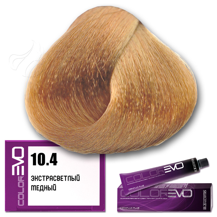 Selective Крем-краска для волос Colorevo  (Selective Professional) . Тон 10.4 - экстрасветлый блондин медный.   Серия медная. Объем: 100 мл Перманентная краска с интенсивным покрывающим эффектом, идеальна для окрашивания волос со 100% сединой. Тона крем-краски Colorevo можно смешивать с корректорами Colorevo Mix, а также между собой, получая разную гамму цветов для реализации любого желания клиента. Краска проста в подготовке и, благодаря кремообразной консистенции, равномерно распределяется по волосам, плотно покрывая их.       КОРРЕКТОРЫ   7 корректоров: нейтральный, корректор осветления, синий, пепельный интенсивный, желтый, красный интенсивный, фиолетовый интенсивный. Colorevo Mix - это чистые тона, позволяющие устранить ненужные оттенки или создать бесконечные цветовые вариации.       АКТИВНЫЕ КОМПОНЕНТЫ CERAFLUX PLUS Color Diffusion System - инновационные керамиды. Система Ceraflux Plus позволяет красителю восстанавливать волосы одновременно с окрашиванием, ламинировать и защищать, долго сохранять цвет и делать его устойчивым. Фитостеролы - активные вещества растительного происхождения - увлажняют, кондиционируют и защищают волосы. Сбалансированные эмульгаторы и регуляторы консистенции - обеспечивают одинаковую вязкость, устойчивость к изменениям окружающей среды. Увлажняющий компонент - для наилучшей адгезии (прилипания) к волосам. Хелатирующий агент - для нейтрализации металлических примесей, которые могут помешать при проявлении цвета. Антиоксиданты - сохраняют неизменным продукт с течением времени. Приятный цветочный аромат. Контролируемый уровень аммиака - минимальное количество для максимального результата.     КАК ПРИМЕНЯТЬ?   Крем-краска Colorevo смешивается с окислительной эмульсией Colorevo Oxy (3%, 6%, 9%, 12%) в пропорции 1:1 (например, 100 мл Colorevo + 100 мл Colorevo Oxy 3-6-9%). Наносится на сухие, немытые волосы. Время выдержки 30 минут.   ColorEVO Blond - суперосветляющая серия, которая работает на натуральной базе и способна осветлить волосы на 4-5 тонов. При использовании суперосветляющей серии пропорция смешивания крем-краски Colorevo с окислительной эмульсией Colorevo Oxy составляет 1:2 (100 мл Colorevo + 200 мл Colorevo Oxy 12%). Время выдержки 45 минут.   Colorevo Mix (корректоры) - добавляются в краску в количестве, необходимом для выбранного нюанса. Чем светлее тон, тем меньше требуется Colorevo Mix, за исключением Colorevo Blond. Для тонов 9-10 уровня рекомендуется добавить не более 5% от общего количества крем-краски, в то время как для более темных нюансов следует использовать больше корректора. В любом случае, количество добавляемого Colorevo Mix не должно превышать 30%. Затем смешивается общее количество крема в пропорции 1:1 (Colorevo + Colorevo Oxy) или 1:2 (Colorevo Blond + Colorevo Oxy 12%).     КСТАТИ...   CERAFLUX PLUS - это биоидентичный концентрат липидов. Его состав повторяет состав липидов, обычно присутствующих в кутикуле волос. Только биоидентичный комплекс позволяет вносить активные компоненты в нужном качестве и количестве, чтобы создать идеальный косметический эффект.       ПРЕИМУЩЕСТВА   Запатентованная новая технология CERAFLUX PLUS Color Diffusion System - биоидентичный концентрат липидов. Максимально широкий выбор оттенков (более 170 оттенков). Сохранение цвета в течение длительного времени. Крем-краска с питательными и ухаживающими компонентами. Волосы более плотные и послушные при последующей обработке. Безопасный продукт без риска для здоровья. Сертифицированная система у