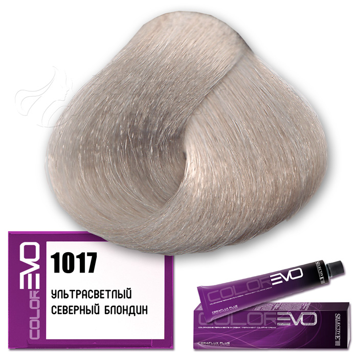Selective Крем-краска для волос Colorevo  (Selective Professional) . Тон 1017 - ультрасветлый северный блондин. Серия суперосветляющая.   Объем: 100 мл Перманентная краска с интенсивным покрывающим эффектом, идеальна для окрашивания волос со 100% сединой. Тона крем-краски Colorevo можно смешивать с корректорами Colorevo Mix, а также между собой, получая разную гамму цветов для реализации любого желания клиента. Краска проста в подготовке и, благодаря кремообразной консистенции, равномерно распределяется по волосам, плотно покрывая их.       КОРРЕКТОРЫ   7 корректоров: нейтральный, корректор осветления, синий, пепельный интенсивный, желтый, красный интенсивный, фиолетовый интенсивный. Colorevo Mix - это чистые тона, позволяющие устранить ненужные оттенки или создать бесконечные цветовые вариации.       АКТИВНЫЕ ИНГРЕДИЕНТЫ CERAFLUX PLUS Color Diffusion System - инновационные керамиды. Система Ceraflux Plus позволяет красителю восстанавливать волосы одновременно с окрашиванием, ламинировать и защищать, долго сохранять цвет и делать его устойчивым. Фитостеролы - активные вещества растительного происхождения - увлажняют, кондиционируют и защищают волосы. Сбалансированные эмульгаторы и регуляторы консистенции - обеспечивают одинаковую вязкость, устойчивость к изменениям окружающей среды. Увлажняющий компонент - для наилучшей адгезии (прилипания) к волосам. Хелатирующий агент - для нейтрализации металлических примесей, которые могут помешать при проявлении цвета. Антиоксиданты - сохраняют неизменным продукт с течением времени. Приятный цветочный аромат. Контролируемый уровень аммиака - минимальное количество для максимального результата.     КАК ПРИМЕНЯТЬ?   Крем-краска Colorevo смешивается с окислительной эмульсией Colorevo Oxy (3%, 6%, 9%, 12%) в пропорции 1:1 (например, 100 мл Colorevo + 100 мл Colorevo Oxy 3-6-9%). Наносится на сухие, немытые волосы. Время выдержки 30 минут.   ColorEVO Blond - суперосветляющая серия, которая работает на натуральной базе и способна осветлить волосы на 4-5 тонов. При использовании суперосветляющей серии пропорция смешивания крем-краски Colorevo с окислительной эмульсией Colorevo Oxy составляет 1:2 (100 мл Colorevo + 200 мл Colorevo Oxy 12%). Время выдержки 45 минут.   Colorevo Mix (корректоры) - добавляются в краску в количестве, необходимом для выбранного нюанса. Чем светлее тон, тем меньше требуется Colorevo Mix, за исключением Colorevo Blond. Для тонов 9-10 уровня рекомендуется добавить не более 5% от общего количества крем-краски, в то время как для более темных нюансов следует использовать больше корректора. В любом случае, количество добавляемого Colorevo Mix не должно превышать 30%. Затем смешивается общее количество крема в пропорции 1:1 (Colorevo + Colorevo Oxy) или 1:2 (Colorevo Blond + Colorevo Oxy 12%).     КСТАТИ...   CERAFLUX PLUS - это биоидентичный концентрат липидов. Его состав повторяет состав липидов, обычно присутствующих в кутикуле волос. Только биоидентичный комплекс позволяет вносить активные компоненты в нужном качестве и количестве, чтобы создать идеальный косметический эффект.       ПРЕИМУЩЕСТВА   Запатентованная новая технология CERAFLUX PLUS Color Diffusion System - биоидентичный концентрат липидов. Максимально широкий выбор оттенков (более 170 оттенков). Сохранение цвета в течение длительного времени. Крем-краска с питательными и ухаживающими компонентами. Волосы более плотные и послушные при последующей обработке. Безопасный продукт без риска для здоровья. Сертифицирова