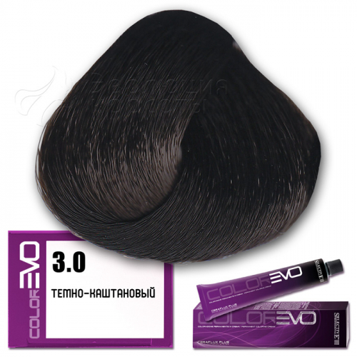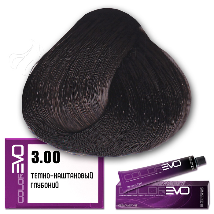 Selective Крем-краска для волос Colorevo  (Selective Professional) . Тон 3.00 - темно-каштановый глубокий. Серия натуральные цвета. Объем: 100 мл Перманентная краска для волос с интенсивным покрывающим эффектом, идеальна для окрашивания волос со 100% сединой. Тона крем-краски Colorevo можно смешивать с корректорами Colorevo Mix, а также между собой, получая разную гамму цветов для реализации любого желания клиента. Краска проста в подготовке и, благодаря кремообразной консистенции, равномерно распределяется по волосам, плотно покрывая их.       КОРРЕКТОРЫ   7 корректоров: нейтральный, корректор осветления, синий, пепельный интенсивный, желтый, красный интенсивный, фиолетовый интенсивный. Colorevo Mix - это чистые тона, позволяющие устранить ненужные оттенки или создать бесконечные цветовые вариации.       АКТИВНЫЕ КОМПОНЕНТЫ CERAFLUX PLUS Color Diffusion System - инновационные керамиды. Система Ceraflux Plus позволяет красителю восстанавливать волосы одновременно с окрашиванием, ламинировать и защищать, долго сохранять цвет и делать его устойчивым. Фитостеролы - активные вещества растительного происхождения - увлажняют, кондиционируют и защищают волосы. Сбалансированные эмульгаторы и регуляторы консистенции - обеспечивают одинаковую вязкость, устойчивость к изменениям окружающей среды. Увлажняющий компонент - для наилучшей адгезии (прилипания) к волосам. Хелатирующий агент - для нейтрализации металлических примесей, которые могут помешать при проявлении цвета. Антиоксиданты - сохраняют неизменным продукт с течением времени. Приятный цветочный аромат. Контролируемый уровень аммиака - минимальное количество для максимального результата.     КАК ПРИМЕНЯТЬ?   Крем-краска Colorevo смешивается с окислительной эмульсией Colorevo Oxy (3%, 6%, 9%, 12%) в пропорции 1:1 (например, 100 мл Colorevo + 100 мл Colorevo Oxy 3-6-9%). Наносится на сухие, немытые волосы. Время выдержки 30 минут.   ColorEVO Blond - суперосветляющая серия, которая работает на натуральной базе и способна осветлить волосы на 4-5 тонов. При использовании суперосветляющей серии пропорция смешивания крем-краски Colorevo с окислительной эмульсией Colorevo Oxy составляет 1:2 (100 мл Colorevo + 200 мл Colorevo Oxy 12%). Время выдержки 45 минут.   Colorevo Mix (корректоры) - добавляются в краску в количестве, необходимом для выбранного нюанса. Чем светлее тон, тем меньше требуется Colorevo Mix, за исключением Colorevo Blond. Для тонов 9-10 уровня рекомендуется добавить не более 5% от общего количества крем-краски, в то время как для более темных нюансов следует использовать больше корректора. В любом случае, количество добавляемого Colorevo Mix не должно превышать 30%. Затем смешивается общее количество крема в пропорции 1:1 (Colorevo + Colorevo Oxy) или 1:2 (Colorevo Blond + Colorevo Oxy 12%).     КСТАТИ...   CERAFLUX PLUS - это биоидентичный концентрат липидов. Его состав повторяет состав липидов, обычно присутствующих в кутикуле волос. Только биоидентичный комплекс позволяет вносить активные компоненты в нужном качестве и количестве, чтобы создать идеальный косметический эффект.       ПРЕИМУЩЕСТВА   Запатентованная новая технология CERAFLUX PLUS Color Diffusion System - биоидентичный концентрат липидов. Максимально широкий выбор оттенков (более 170 оттенков). Сохранение цвета в течение длительного времени. Крем-краска с питательными и ухаживающими компонентами. Волосы более плотные и послушные при последующей обработке. Безопасный продукт без риска для здоровья. Сертифициро