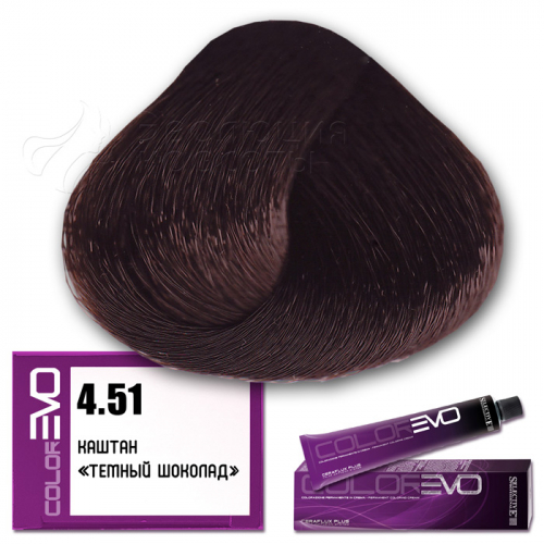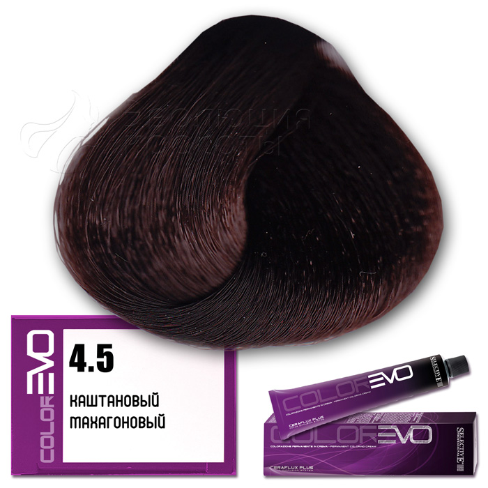 Selective Крем-краска для волос Colorevo  (Selective Professional) . Тон 4.5 - каштановый махагоновый. Серия махагоновая. Объем: 100 мл. Перманентная крем-краска Colorevo с интенсивным покрывающим эффектом, идеальна для окрашивания волос со 100% сединой. Тона крем-краски Colorevo можно смешивать с корректорами Colorevo Mix, а также между собой, получая разную гамму цветов для реализации любого желания клиента. Краска проста в подготовке и, благодаря кремообразной консистенции, равномерно распределяется по волосам, плотно покрывая их.       КОРРЕКТОРЫ   7 корректоров: нейтральный, корректор осветления, синий, пепельный интенсивный, желтый, красный интенсивный, фиолетовый интенсивный. Colorevo Mix - это чистые тона, позволяющие устранить ненужные оттенки или создать бесконечные цветовые вариации.       АКТИВНЫЕ КОМПОНЕНТЫ CERAFLUX PLUS Color Diffusion System - инновационные керамиды. Система Ceraflux Plus позволяет красителю восстанавливать волосы одновременно с окрашиванием, ламинировать и защищать, долго сохранять цвет и делать его устойчивым. Фитостеролы - активные вещества растительного происхождения - увлажняют, кондиционируют и защищают волосы. Сбалансированные эмульгаторы и регуляторы консистенции - обеспечивают одинаковую вязкость, устойчивость к изменениям окружающей среды. Увлажняющий компонент - для наилучшей адгезии (прилипания) к волосам. Хелатирующий агент - для нейтрализации металлических примесей, которые могут помешать при проявлении цвета. Антиоксиданты - сохраняют неизменным продукт с течением времени. Приятный цветочный аромат. Контролируемый уровень аммиака - минимальное количество для максимального результата.     КАК ПРИМЕНЯТЬ?   Крем-краска Colorevo смешивается с окислительной эмульсией Colorevo Oxy (3%, 6%, 9%, 12%) в пропорции 1:1 (например, 100 мл Colorevo + 100 мл Colorevo Oxy 3-6-9%). Наносится на сухие, немытые волосы. Время выдержки 30 минут.   ColorEVO Blond - суперосветляющая серия, которая работает на натуральной базе и способна осветлить волосы на 4-5 тонов. При использовании суперосветляющей серии пропорция смешивания крем-краски Colorevo с окислительной эмульсией Colorevo Oxy составляет 1:2 (100 мл Colorevo + 200 мл Colorevo Oxy 12%). Время выдержки 45 минут.   Colorevo Mix (корректоры) - добавляются в краску в количестве, необходимом для выбранного нюанса. Чем светлее тон, тем меньше требуется Colorevo Mix, за исключением Colorevo Blond. Для тонов 9-10 уровня рекомендуется добавить не более 5% от общего количества крем-краски, в то время как для более темных нюансов следует использовать больше корректора. В любом случае, количество добавляемого Colorevo Mix не должно превышать 30%. Затем смешивается общее количество крема в пропорции 1:1 (Colorevo + Colorevo Oxy) или 1:2 (Colorevo Blond + Colorevo Oxy 12%).     КСТАТИ...   CERAFLUX PLUS - это биоидентичный концентрат липидов. Его состав повторяет состав липидов, обычно присутствующих в кутикуле волос. Только биоидентичный комплекс позволяет вносить активные компоненты в нужном качестве и количестве, чтобы создать идеальный косметический эффект.       ПРЕИМУЩЕСТВА   Запатентованная новая технология CERAFLUX PLUS Color Diffusion System - биоидентичный концентрат липидов. Максимально широкий выбор оттенков (более 170 оттенков). Сохранение цвета в течение длительного времени. Крем-краска с питательными и ухаживающими компонентами. Волосы более плотные и послушные при последующей обработке. Безопасный продукт без риска для здоровья. Сертифицированная си
