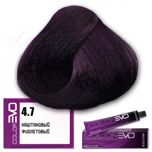 Selective Крем-краска для волос Colorevo  (Selective Professional) . Тон 4.7 - каштановый фиолетовый. Серия фиолетовая. Объем: 100 мл. Перманентная краска с интенсивным покрывающим эффектом, идеальна для окрашивания волос со 100% сединой. Тона крем-краски Colorevo можно смешивать с корректорами Colorevo Mix, а также между собой, получая разную гамму цветов для реализации любого желания клиента. Краска проста в подготовке и, благодаря кремообразной консистенции, равномерно распределяется по волосам, плотно покрывая их.       КОРРЕКТОРЫ   7 корректоров: нейтральный, корректор осветления, синий, пепельный интенсивный, желтый, красный интенсивный, фиолетовый интенсивный. Colorevo Mix - это чистые тона, позволяющие устранить ненужные оттенки или создать бесконечные цветовые вариации.       АКТИВНЫЕ КОМПОНЕНТЫ CERAFLUX PLUS Color Diffusion System - инновационные керамиды. Система Ceraflux Plus позволяет красителю восстанавливать волосы одновременно с окрашиванием, ламинировать и защищать, долго сохранять цвет и делать его устойчивым. Фитостеролы - активные вещества растительного происхождения - увлажняют, кондиционируют и защищают волосы. Сбалансированные эмульгаторы и регуляторы консистенции - обеспечивают одинаковую вязкость, устойчивость к изменениям окружающей среды. Увлажняющий компонент - для наилучшей адгезии (прилипания) к волосам. Хелатирующий агент - для нейтрализации металлических примесей, которые могут помешать при проявлении цвета. Антиоксиданты - сохраняют неизменным продукт с течением времени. Приятный цветочный аромат. Контролируемый уровень аммиака - минимальное количество для максимального результата.     КАК ПРИМЕНЯТЬ?   Крем-краска Colorevo смешивается с окислительной эмульсией Colorevo Oxy (3%, 6%, 9%, 12%) в пропорции 1:1 (например, 100 мл Colorevo + 100 мл Colorevo Oxy 3-6-9%). Наносится на сухие, немытые волосы. Время выдержки 30 минут.   ColorEVO Blond - суперосветляющая серия, которая работает на натуральной базе и способна осветлить волосы на 4-5 тонов. При использовании суперосветляющей серии пропорция смешивания крем-краски Colorevo с окислительной эмульсией Colorevo Oxy составляет 1:2 (100 мл Colorevo + 200 мл Colorevo Oxy 12%). Время выдержки 45 минут.   Colorevo Mix (корректоры) - добавляются в краску в количестве, необходимом для выбранного нюанса. Чем светлее тон, тем меньше требуется Colorevo Mix, за исключением Colorevo Blond. Для тонов 9-10 уровня рекомендуется добавить не более 5% от общего количества крем-краски, в то время как для более темных нюансов следует использовать больше корректора. В любом случае, количество добавляемого Colorevo Mix не должно превышать 30%. Затем смешивается общее количество крема в пропорции 1:1 (Colorevo + Colorevo Oxy) или 1:2 (Colorevo Blond + Colorevo Oxy 12%).     КСТАТИ...   CERAFLUX PLUS - это биоидентичный концентрат липидов. Его состав повторяет состав липидов, обычно присутствующих в кутикуле волос. Только биоидентичный комплекс позволяет вносить активные компоненты в нужном качестве и количестве, чтобы создать идеальный косметический эффект.       ПРЕИМУЩЕСТВА   Запатентованная новая технология CERAFLUX PLUS Color Diffusion System - биоидентичный концентрат липидов. Максимально широкий выбор оттенков (более 170 оттенков). Сохранение цвета в течение длительного времени. Крем-краска с питательными и ухаживающими компонентами. Волосы более плотные и послушные при последующей обработке. Безопасный продукт без риска для здоровья. Сертифицированная система управ
