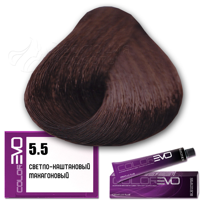 Selective Крем-краска для волос Colorevo  (Selective Professional) . Тон 5.5 - светло-каштановый махагоновый. Серия махагоновая. Объем: 100 мл Перманентная краска с интенсивным покрывающим эффектом, идеальна для окрашивания волос со 100% сединой. Тона крем-краски Colorevo можно смешивать с корректорами Colorevo Mix, а также между собой, получая разную гамму цветов для реализации любого желания клиента. Краска проста в подготовке и, благодаря кремообразной консистенции, равномерно распределяется по волосам, плотно покрывая их.       КОРРЕКТОРЫ   7 корректоров: нейтральный, корректор осветления, синий, пепельный интенсивный, желтый, красный интенсивный, фиолетовый интенсивный. Colorevo Mix - это чистые тона, позволяющие устранить ненужные оттенки или создать бесконечные цветовые вариации.       АКТИВНЫЕ КОМПОНЕНТЫ CERAFLUX PLUS Color Diffusion System - инновационные керамиды. Система Ceraflux Plus позволяет красителю восстанавливать волосы одновременно с окрашиванием, ламинировать и защищать, долго сохранять цвет и делать его устойчивым. Фитостеролы - активные вещества растительного происхождения - увлажняют, кондиционируют и защищают волосы. Сбалансированные эмульгаторы и регуляторы консистенции - обеспечивают одинаковую вязкость, устойчивость к изменениям окружающей среды. Увлажняющий компонент - для наилучшей адгезии (прилипания) к волосам. Хелатирующий агент - для нейтрализации металлических примесей, которые могут помешать при проявлении цвета. Антиоксиданты - сохраняют неизменным продукт с течением времени. Приятный цветочный аромат. Контролируемый уровень аммиака - минимальное количество для максимального результата.     КАК ПРИМЕНЯТЬ?   Крем-краска Colorevo смешивается с окислительной эмульсией Colorevo Oxy (3%, 6%, 9%, 12%) в пропорции 1:1 (например, 100 мл Colorevo + 100 мл Colorevo Oxy 3-6-9%). Наносится на сухие, немытые волосы. Время выдержки 30 минут.   ColorEVO Blond - суперосветляющая серия, которая работает на натуральной базе и способна осветлить волосы на 4-5 тонов. При использовании суперосветляющей серии пропорция смешивания крем-краски Colorevo с окислительной эмульсией Colorevo Oxy составляет 1:2 (100 мл Colorevo + 200 мл Colorevo Oxy 12%). Время выдержки 45 минут.   Colorevo Mix (корректоры) - добавляются в краску в количестве, необходимом для выбранного нюанса. Чем светлее тон, тем меньше требуется Colorevo Mix, за исключением Colorevo Blond. Для тонов 9-10 уровня рекомендуется добавить не более 5% от общего количества крем-краски, в то время как для более темных нюансов следует использовать больше корректора. В любом случае, количество добавляемого Colorevo Mix не должно превышать 30%. Затем смешивается общее количество крема в пропорции 1:1 (Colorevo + Colorevo Oxy) или 1:2 (Colorevo Blond + Colorevo Oxy 12%).     КСТАТИ...   CERAFLUX PLUS - это биоидентичный концентрат липидов. Его состав повторяет состав липидов, обычно присутствующих в кутикуле волос. Только биоидентичный комплекс позволяет вносить активные компоненты в нужном качестве и количестве, чтобы создать идеальный косметический эффект.       ПРЕИМУЩЕСТВА   Запатентованная новая технология CERAFLUX PLUS Color Diffusion System - биоидентичный концентрат липидов. Максимально широкий выбор оттенков (более 170 оттенков). Сохранение цвета в течение длительного времени. Крем-краска с питательными и ухаживающими компонентами. Волосы более плотные и послушные при последующей обработке. Безопасный продукт без риска для здоровья. Сертифицированная систе