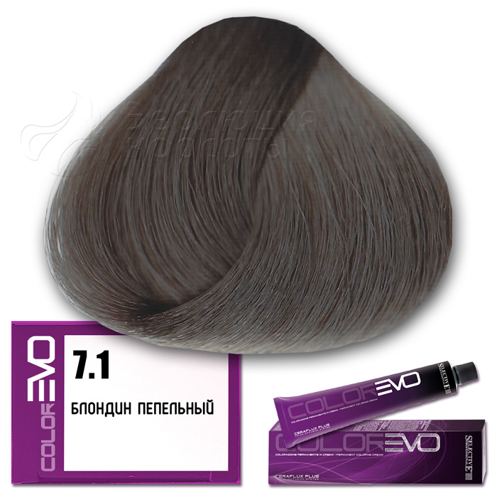 Selective Крем-краска для волос Colorevo  (Selective Professional) . Тон 7.1 - блондин пепельный. Серия пепельная. Объем: 100 мл Перманентная краска с интенсивным покрывающим эффектом, идеальна для окрашивания волос со 100% сединой. Тона крем-краски Colorevo можно смешивать с корректорами Colorevo Mix, а также между собой, получая разную гамму цветов для реализации любого желания клиента. Краска проста в подготовке и, благодаря кремообразной консистенции, равномерно распределяется по волосам, плотно покрывая их.       КОРРЕКТОРЫ   7 корректоров: нейтральный, корректор осветления, синий, пепельный интенсивный, желтый, красный интенсивный, фиолетовый интенсивный. Colorevo Mix - это чистые тона, позволяющие устранить ненужные оттенки или создать бесконечные цветовые вариации.       АКТИВНЫЕ КОМПОНЕНТЫ CERAFLUX PLUS Color Diffusion System - инновационные керамиды. Система Ceraflux Plus позволяет красителю восстанавливать волосы одновременно с окрашиванием, ламинировать и защищать, долго сохранять цвет и делать его устойчивым. Фитостеролы - активные вещества растительного происхождения - увлажняют, кондиционируют и защищают волосы. Сбалансированные эмульгаторы и регуляторы консистенции - обеспечивают одинаковую вязкость, устойчивость к изменениям окружающей среды. Увлажняющий компонент - для наилучшей адгезии (прилипания) к волосам. Хелатирующий агент - для нейтрализации металлических примесей, которые могут помешать при проявлении цвета. Антиоксиданты - сохраняют неизменным продукт с течением времени. Приятный цветочный аромат. Контролируемый уровень аммиака - минимальное количество для максимального результата.     КАК ПРИМЕНЯТЬ?   Крем-краска Colorevo смешивается с окислительной эмульсией Colorevo Oxy (3%, 6%, 9%, 12%) в пропорции 1:1 (например, 100 мл Colorevo + 100 мл Colorevo Oxy 3-6-9%). Наносится на сухие, немытые волосы. Время выдержки 30 минут.   ColorEVO Blond - суперосветляющая серия, которая работает на натуральной базе и способна осветлить волосы на 4-5 тонов. При использовании суперосветляющей серии пропорция смешивания крем-краски Colorevo с окислительной эмульсией Colorevo Oxy составляет 1:2 (100 мл Colorevo + 200 мл Colorevo Oxy 12%). Время выдержки 45 минут.   Colorevo Mix (корректоры) - добавляются в краску в количестве, необходимом для выбранного нюанса. Чем светлее тон, тем меньше требуется Colorevo Mix, за исключением Colorevo Blond. Для тонов 9-10 уровня рекомендуется добавить не более 5% от общего количества крем-краски, в то время как для более темных нюансов следует использовать больше корректора. В любом случае, количество добавляемого Colorevo Mix не должно превышать 30%. Затем смешивается общее количество крема в пропорции 1:1 (Colorevo + Colorevo Oxy) или 1:2 (Colorevo Blond + Colorevo Oxy 12%).     КСТАТИ...   CERAFLUX PLUS - это биоидентичный концентрат липидов. Его состав повторяет состав липидов, обычно присутствующих в кутикуле волос. Только биоидентичный комплекс позволяет вносить активные компоненты в нужном качестве и количестве, чтобы создать идеальный косметический эффект.       ПРЕИМУЩЕСТВА   Запатентованная новая технология CERAFLUX PLUS Color Diffusion System - биоидентичный концентрат липидов. Максимально широкий выбор оттенков (более 170 оттенков). Сохранение цвета в течение длительного времени. Крем-краска с питательными и ухаживающими компонентами. Волосы более плотные и послушные при последующей обработке. Безопасный продукт без риска для здоровья. Сертифицированная система управления 