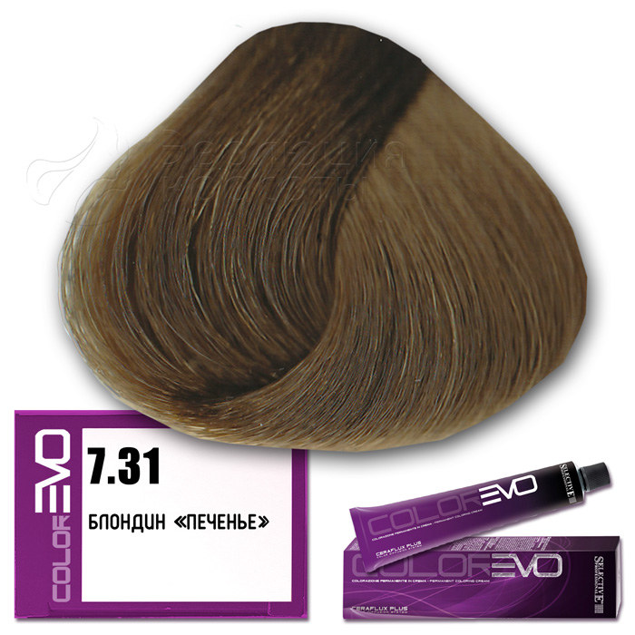 Selective Крем-краска для волос Colorevo  (Selective Professional) . Тон 7.31 - блондин печенье. Серия Фантазия. Объем: 100 мл Перманентная краска с интенсивным покрывающим эффектом, идеальна для окрашивания волос со 100% сединой. Тона крем-краски Colorevo можно смешивать с корректорами Colorevo Mix, а также между собой, получая разную гамму цветов для реализации любого желания клиента. Краска проста в подготовке и, благодаря кремообразной консистенции, равномерно распределяется по волосам, плотно покрывая их.       КОРРЕКТОРЫ   7 корректоров: нейтральный, корректор осветления, синий, пепельный интенсивный, желтый, красный интенсивный, фиолетовый интенсивный. Colorevo Mix - это чистые тона, позволяющие устранить ненужные оттенки или создать бесконечные цветовые вариации.       АКТИВНЫЕ КОМПОНЕНТЫ CERAFLUX PLUS Color Diffusion System - инновационные керамиды. Система Ceraflux Plus позволяет красителю восстанавливать волосы одновременно с окрашиванием, ламинировать и защищать, долго сохранять цвет и делать его устойчивым. Фитостеролы - активные вещества растительного происхождения - увлажняют, кондиционируют и защищают волосы. Сбалансированные эмульгаторы и регуляторы консистенции - обеспечивают одинаковую вязкость, устойчивость к изменениям окружающей среды. Увлажняющий компонент - для наилучшей адгезии (прилипания) к волосам. Хелатирующий агент - для нейтрализации металлических примесей, которые могут помешать при проявлении цвета. Антиоксиданты - сохраняют неизменным продукт с течением времени. Приятный цветочный аромат. Контролируемый уровень аммиака - минимальное количество для максимального результата.     КАК ПРИМЕНЯТЬ?   Крем-краска Colorevo смешивается с окислительной эмульсией Colorevo Oxy (3%, 6%, 9%, 12%) в пропорции 1:1 (например, 100 мл Colorevo + 100 мл Colorevo Oxy 3-6-9%). Наносится на сухие, немытые волосы. Время выдержки 30 минут.   ColorEVO Blond - суперосветляющая серия, которая работает на натуральной базе и способна осветлить волосы на 4-5 тонов. При использовании суперосветляющей серии пропорция смешивания крем-краски Colorevo с окислительной эмульсией Colorevo Oxy составляет 1:2 (100 мл Colorevo + 200 мл Colorevo Oxy 12%). Время выдержки 45 минут.   Colorevo Mix (корректоры) - добавляются в краску в количестве, необходимом для выбранного нюанса. Чем светлее тон, тем меньше требуется Colorevo Mix, за исключением Colorevo Blond. Для тонов 9-10 уровня рекомендуется добавить не более 5% от общего количества крем-краски, в то время как для более темных нюансов следует использовать больше корректора. В любом случае, количество добавляемого Colorevo Mix не должно превышать 30%. Затем смешивается общее количество крема в пропорции 1:1 (Colorevo + Colorevo Oxy) или 1:2 (Colorevo Blond + Colorevo Oxy 12%).     КСТАТИ...   CERAFLUX PLUS - это биоидентичный концентрат липидов. Его состав повторяет состав липидов, обычно присутствующих в кутикуле волос. Только биоидентичный комплекс позволяет вносить активные компоненты в нужном качестве и количестве, чтобы создать идеальный косметический эффект.       ПРЕИМУЩЕСТВА   Запатентованная новая технология CERAFLUX PLUS Color Diffusion System - биоидентичный концентрат липидов. Максимально широкий выбор оттенков (более 170 оттенков). Сохранение цвета в течение длительного времени. Крем-краска с питательными и ухаживающими компонентами. Волосы более плотные и послушные при последующей обработке. Безопасный продукт без риска для здоровья. Сертифицированная система управления кач
