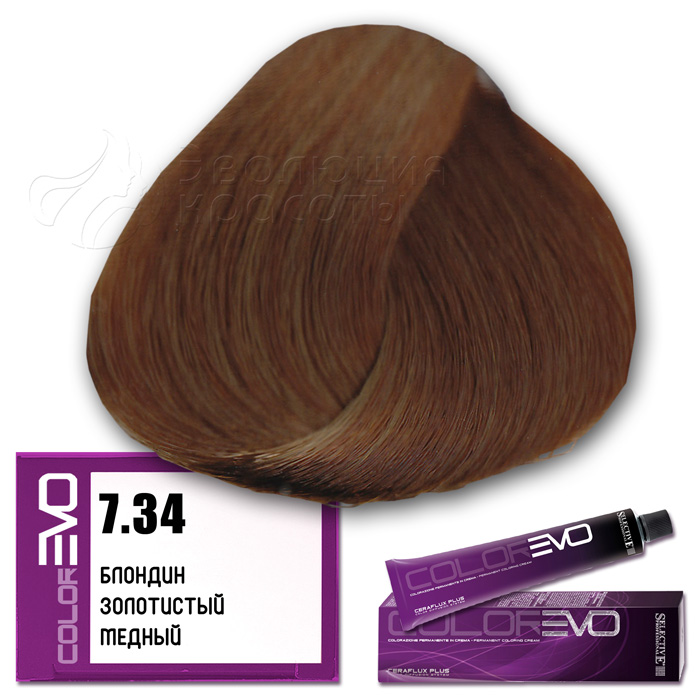 Selective Крем-краска для волос Colorevo  (Selective Professional) . Тон 7.34 - блондин золотистый медный. Серия золотистая. Объем: 100 мл Перманентная краска с интенсивным покрывающим эффектом, идеальна для окрашивания волос со 100% сединой. Тона крем-краски Colorevo можно смешивать с корректорами Colorevo Mix, а также между собой, получая разную гамму цветов для реализации любого желания клиента. Краска проста в подготовке и, благодаря кремообразной консистенции, равномерно распределяется по волосам, плотно покрывая их.       КОРРЕКТОРЫ   7 корректоров: нейтральный, корректор осветления, синий, пепельный интенсивный, желтый, красный интенсивный, фиолетовый интенсивный. Colorevo Mix - это чистые тона, позволяющие устранить ненужные оттенки или создать бесконечные цветовые вариации.       АКТИВНЫЕ КОМПОНЕНТЫ CERAFLUX PLUS Color Diffusion System - инновационные керамиды. Система Ceraflux Plus позволяет красителю восстанавливать волосы одновременно с окрашиванием, ламинировать и защищать, долго сохранять цвет и делать его устойчивым. Фитостеролы - активные вещества растительного происхождения - увлажняют, кондиционируют и защищают волосы. Сбалансированные эмульгаторы и регуляторы консистенции - обеспечивают одинаковую вязкость, устойчивость к изменениям окружающей среды. Увлажняющий компонент - для наилучшей адгезии (прилипания) к волосам. Хелатирующий агент - для нейтрализации металлических примесей, которые могут помешать при проявлении цвета. Антиоксиданты - сохраняют неизменным продукт с течением времени. Приятный цветочный аромат. Контролируемый уровень аммиака - минимальное количество для максимального результата.     КАК ПРИМЕНЯТЬ?   Крем-краска Colorevo смешивается с окислительной эмульсией Colorevo Oxy (3%, 6%, 9%, 12%) в пропорции 1:1 (например, 100 мл Colorevo + 100 мл Colorevo Oxy 3-6-9%). Наносится на сухие, немытые волосы. Время выдержки 30 минут.   ColorEVO Blond - суперосветляющая серия, которая работает на натуральной базе и способна осветлить волосы на 4-5 тонов. При использовании суперосветляющей серии пропорция смешивания крем-краски Colorevo с окислительной эмульсией Colorevo Oxy составляет 1:2 (100 мл Colorevo + 200 мл Colorevo Oxy 12%). Время выдержки 45 минут.   Colorevo Mix (корректоры) - добавляются в краску в количестве, необходимом для выбранного нюанса. Чем светлее тон, тем меньше требуется Colorevo Mix, за исключением Colorevo Blond. Для тонов 9-10 уровня рекомендуется добавить не более 5% от общего количества крем-краски, в то время как для более темных нюансов следует использовать больше корректора. В любом случае, количество добавляемого Colorevo Mix не должно превышать 30%. Затем смешивается общее количество крема в пропорции 1:1 (Colorevo + Colorevo Oxy) или 1:2 (Colorevo Blond + Colorevo Oxy 12%).     КСТАТИ...   CERAFLUX PLUS - это биоидентичный концентрат липидов. Его состав повторяет состав липидов, обычно присутствующих в кутикуле волос. Только биоидентичный комплекс позволяет вносить активные компоненты в нужном качестве и количестве, чтобы создать идеальный косметический эффект.       ПРЕИМУЩЕСТВА   Запатентованная новая технология CERAFLUX PLUS Color Diffusion System - биоидентичный концентрат липидов. Максимально широкий выбор оттенков (более 170 оттенков). Сохранение цвета в течение длительного времени. Крем-краска с питательными и ухаживающими компонентами. Волосы более плотные и послушные при последующей обработке. Безопасный продукт без риска для здоровья. Сертифицированная система уп