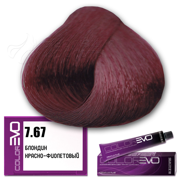 Selective Крем-краска для волос Colorevo  (Selective Professional) . Тон 7.67 - блондин красно-фиолетовый. Серия красная. Объем: 100 мл Перманентная краска с интенсивным покрывающим эффектом, идеальна для окрашивания волос со 100% сединой. Тона крем-краски Colorevo можно смешивать с корректорами Colorevo Mix, а также между собой, получая разную гамму цветов для реализации любого желания клиента. Краска проста в подготовке и, благодаря кремообразной консистенции, равномерно распределяется по волосам, плотно покрывая их.       КОРРЕКТОРЫ   7 корректоров: нейтральный, корректор осветления, синий, пепельный интенсивный, желтый, красный интенсивный, фиолетовый интенсивный. Colorevo Mix - это чистые тона, позволяющие устранить ненужные оттенки или создать бесконечные цветовые вариации.       АКТИВНЫЕ КОМПОНЕНТЫ CERAFLUX PLUS Color Diffusion System - инновационные керамиды. Система Ceraflux Plus позволяет красителю восстанавливать волосы одновременно с окрашиванием, ламинировать и защищать, долго сохранять цвет и делать его устойчивым. Фитостеролы - активные вещества растительного происхождения - увлажняют, кондиционируют и защищают волосы. Сбалансированные эмульгаторы и регуляторы консистенции - обеспечивают одинаковую вязкость, устойчивость к изменениям окружающей среды. Увлажняющий компонент - для наилучшей адгезии (прилипания) к волосам. Хелатирующий агент - для нейтрализации металлических примесей, которые могут помешать при проявлении цвета. Антиоксиданты - сохраняют неизменным продукт с течением времени. Приятный цветочный аромат. Контролируемый уровень аммиака - минимальное количество для максимального результата.     КАК ПРИМЕНЯТЬ?   Крем-краска Colorevo смешивается с окислительной эмульсией Colorevo Oxy (3%, 6%, 9%, 12%) в пропорции 1:1 (например, 100 мл Colorevo + 100 мл Colorevo Oxy 3-6-9%). Наносится на сухие, немытые волосы. Время выдержки 30 минут.   ColorEVO Blond - суперосветляющая серия, которая работает на натуральной базе и способна осветлить волосы на 4-5 тонов. При использовании суперосветляющей серии пропорция смешивания крем-краски Colorevo с окислительной эмульсией Colorevo Oxy составляет 1:2 (100 мл Colorevo + 200 мл Colorevo Oxy 12%). Время выдержки 45 минут.   Colorevo Mix (корректоры) - добавляются в краску в количестве, необходимом для выбранного нюанса. Чем светлее тон, тем меньше требуется Colorevo Mix, за исключением Colorevo Blond. Для тонов 9-10 уровня рекомендуется добавить не более 5% от общего количества крем-краски, в то время как для более темных нюансов следует использовать больше корректора. В любом случае, количество добавляемого Colorevo Mix не должно превышать 30%. Затем смешивается общее количество крема в пропорции 1:1 (Colorevo + Colorevo Oxy) или 1:2 (Colorevo Blond + Colorevo Oxy 12%).     КСТАТИ...   CERAFLUX PLUS - это биоидентичный концентрат липидов. Его состав повторяет состав липидов, обычно присутствующих в кутикуле волос. Только биоидентичный комплекс позволяет вносить активные компоненты в нужном качестве и количестве, чтобы создать идеальный косметический эффект.       ПРЕИМУЩЕСТВА   Запатентованная новая технология CERAFLUX PLUS Color Diffusion System - биоидентичный концентрат липидов. Максимально широкий выбор оттенков (более 170 оттенков). Сохранение цвета в течение длительного времени. Крем-краска с питательными и ухаживающими компонентами. Волосы более плотные и послушные при последующей обработке. Безопасный продукт без риска для здоровья. Сертифицированная система управ