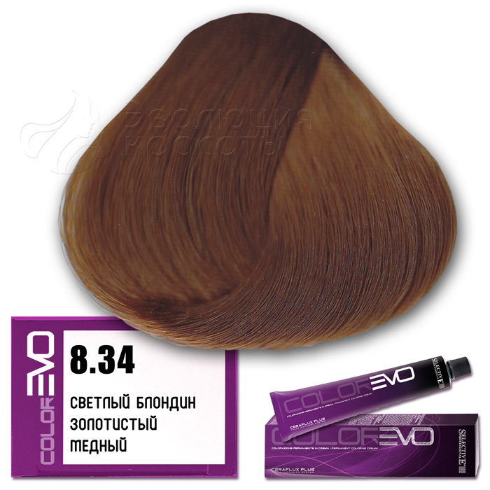 Selective Крем-краска для волос Colorevo  (Selective Professional) . Тон 8.34 - светлый блондин золотистый медный. Серия золотистая. Объем: 100 мл Перманентная краска с интенсивным покрывающим эффектом, идеальна для окрашивания волос со 100% сединой. Тона крем-краски Colorevo можно смешивать с корректорами Colorevo Mix, а также между собой, получая разную гамму цветов для реализации любого желания клиента. Краска проста в подготовке и, благодаря кремообразной консистенции, равномерно распределяется по волосам, плотно покрывая их.       КОРРЕКТОРЫ   7 корректоров: нейтральный, корректор осветления, синий, пепельный интенсивный, желтый, красный интенсивный, фиолетовый интенсивный. Colorevo Mix - это чистые тона, позволяющие устранить ненужные оттенки или создать бесконечные цветовые вариации.       АКТИВНЫЕ КОМПОНЕНТЫ CERAFLUX PLUS Color Diffusion System - инновационные керамиды. Система Ceraflux Plus позволяет красителю восстанавливать волосы одновременно с окрашиванием, ламинировать и защищать, долго сохранять цвет и делать его устойчивым. Фитостеролы - активные вещества растительного происхождения - увлажняют, кондиционируют и защищают волосы. Сбалансированные эмульгаторы и регуляторы консистенции - обеспечивают одинаковую вязкость, устойчивость к изменениям окружающей среды. Увлажняющий компонент - для наилучшей адгезии (прилипания) к волосам. Хелатирующий агент - для нейтрализации металлических примесей, которые могут помешать при проявлении цвета. Антиоксиданты - сохраняют неизменным продукт с течением времени. Приятный цветочный аромат. Контролируемый уровень аммиака - минимальное количество для максимального результата.     КАК ПРИМЕНЯТЬ?   Крем-краска Colorevo смешивается с окислительной эмульсией Colorevo Oxy (3%, 6%, 9%, 12%) в пропорции 1:1 (например, 100 мл Colorevo + 100 мл Colorevo Oxy 3-6-9%). Наносится на сухие, немытые волосы. Время выдержки 30 минут.   ColorEVO Blond - суперосветляющая серия, которая работает на натуральной базе и способна осветлить волосы на 4-5 тонов. При использовании суперосветляющей серии пропорция смешивания крем-краски Colorevo с окислительной эмульсией Colorevo Oxy составляет 1:2 (100 мл Colorevo + 200 мл Colorevo Oxy 12%). Время выдержки 45 минут.   Colorevo Mix (корректоры) - добавляются в краску в количестве, необходимом для выбранного нюанса. Чем светлее тон, тем меньше требуется Colorevo Mix, за исключением Colorevo Blond. Для тонов 9-10 уровня рекомендуется добавить не более 5% от общего количества крем-краски, в то время как для более темных нюансов следует использовать больше корректора. В любом случае, количество добавляемого Colorevo Mix не должно превышать 30%. Затем смешивается общее количество крема в пропорции 1:1 (Colorevo + Colorevo Oxy) или 1:2 (Colorevo Blond + Colorevo Oxy 12%).     КСТАТИ...   CERAFLUX PLUS - это биоидентичный концентрат липидов. Его состав повторяет состав липидов, обычно присутствующих в кутикуле волос. Только биоидентичный комплекс позволяет вносить активные компоненты в нужном качестве и количестве, чтобы создать идеальный косметический эффект.       ПРЕИМУЩЕСТВА   Запатентованная новая технология CERAFLUX PLUS Color Diffusion System - биоидентичный концентрат липидов. Максимально широкий выбор оттенков (более 170 оттенков). Сохранение цвета в течение длительного времени. Крем-краска с питательными и ухаживающими компонентами. Волосы более плотные и послушные при последующей обработке. Безопасный продукт без риска для здоровья. Сертифицированная си