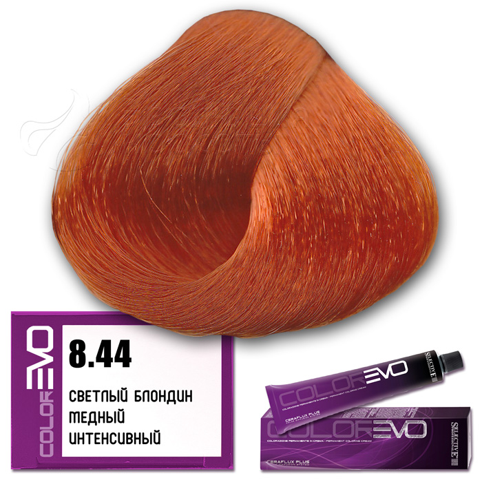 Selective Крем-краска для волос Colorevo  (Selective Professional) . Тон 8.44 - светлый блондин медный интенсивный. Серия медная. Объем: 100 мл Перманентная краска с интенсивным покрывающим эффектом, идеальна для окрашивания волос со 100% сединой. Тона крем-краски Colorevo можно смешивать с корректорами Colorevo Mix, а также между собой, получая разную гамму цветов для реализации любого желания клиента. Краска проста в подготовке и, благодаря кремообразной консистенции, равномерно распределяется по волосам, плотно покрывая их.       КОРРЕКТОРЫ   7 корректоров: нейтральный, корректор осветления, синий, пепельный интенсивный, желтый, красный интенсивный, фиолетовый интенсивный. Colorevo Mix - это чистые тона, позволяющие устранить ненужные оттенки или создать бесконечные цветовые вариации.       АКТИВНЫЕ КОМПОНЕНТЫ CERAFLUX PLUS Color Diffusion System - инновационные керамиды. Система Ceraflux Plus позволяет красителю восстанавливать волосы одновременно с окрашиванием, ламинировать и защищать, долго сохранять цвет и делать его устойчивым. Фитостеролы - активные вещества растительного происхождения - увлажняют, кондиционируют и защищают волосы. Сбалансированные эмульгаторы и регуляторы консистенции - обеспечивают одинаковую вязкость, устойчивость к изменениям окружающей среды. Увлажняющий компонент - для наилучшей адгезии (прилипания) к волосам. Хелатирующий агент - для нейтрализации металлических примесей, которые могут помешать при проявлении цвета. Антиоксиданты - сохраняют неизменным продукт с течением времени. Приятный цветочный аромат. Контролируемый уровень аммиака - минимальное количество для максимального результата.     КАК ПРИМЕНЯТЬ?   Крем-краска Colorevo смешивается с окислительной эмульсией Colorevo Oxy (3%, 6%, 9%, 12%) в пропорции 1:1 (например, 100 мл Colorevo + 100 мл Colorevo Oxy 3-6-9%). Наносится на сухие, немытые волосы. Время выдержки 30 минут.   ColorEVO Blond - суперосветляющая серия, которая работает на натуральной базе и способна осветлить волосы на 4-5 тонов. При использовании суперосветляющей серии пропорция смешивания крем-краски Colorevo с окислительной эмульсией Colorevo Oxy составляет 1:2 (100 мл Colorevo + 200 мл Colorevo Oxy 12%). Время выдержки 45 минут.   Colorevo Mix (корректоры) - добавляются в краску в количестве, необходимом для выбранного нюанса. Чем светлее тон, тем меньше требуется Colorevo Mix, за исключением Colorevo Blond. Для тонов 9-10 уровня рекомендуется добавить не более 5% от общего количества крем-краски, в то время как для более темных нюансов следует использовать больше корректора. В любом случае, количество добавляемого Colorevo Mix не должно превышать 30%. Затем смешивается общее количество крема в пропорции 1:1 (Colorevo + Colorevo Oxy) или 1:2 (Colorevo Blond + Colorevo Oxy 12%).     КСТАТИ...   CERAFLUX PLUS - это биоидентичный концентрат липидов. Его состав повторяет состав липидов, обычно присутствующих в кутикуле волос. Только биоидентичный комплекс позволяет вносить активные компоненты в нужном качестве и количестве, чтобы создать идеальный косметический эффект.       ПРЕИМУЩЕСТВА   Запатентованная новая технология CERAFLUX PLUS Color Diffusion System - биоидентичный концентрат липидов. Максимально широкий выбор оттенков (более 170 оттенков). Сохранение цвета в течение длительного времени. Крем-краска с питательными и ухаживающими компонентами. Волосы более плотные и послушные при последующей обработке. Безопасный продукт без риска для здоровья. Сертифицированная систе