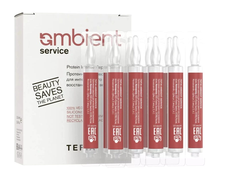 Tefia Протеиновая сыворотка для интенсивного восстановления волос Ambient Service — высококонцентрированный ампульный уход для эффективной реконструкции волос в салонных или домашних условиях. Косметический продукт создан для пористых, поврежденных, сухих, ломких и тусклых волос.