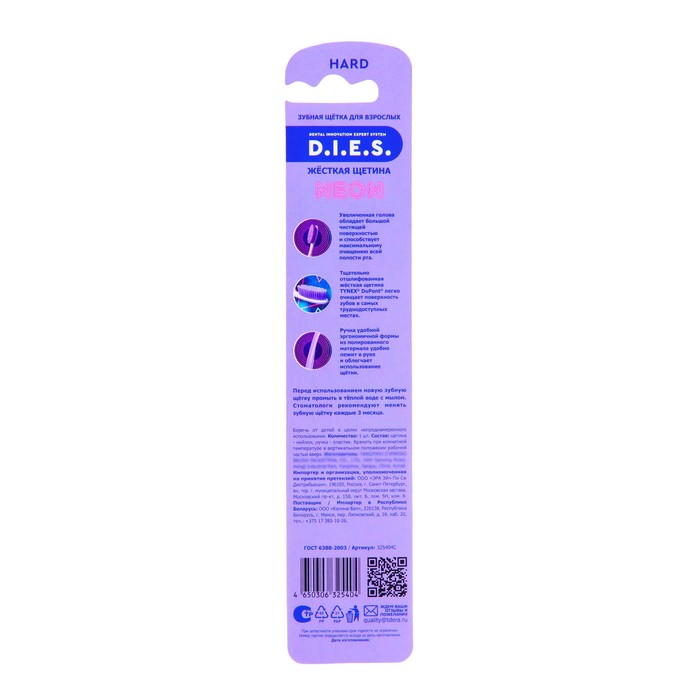 Зубная щетка высокой жесткости быстро удаляет зубной налет и деликатно отбеливает эмаль. Специальная форма головки облегчает доступ к дальним жевательным зубам.Зубная щетка D.I.E.S. NEON – отличный выбор для комплексного ухода за полостью рта.
