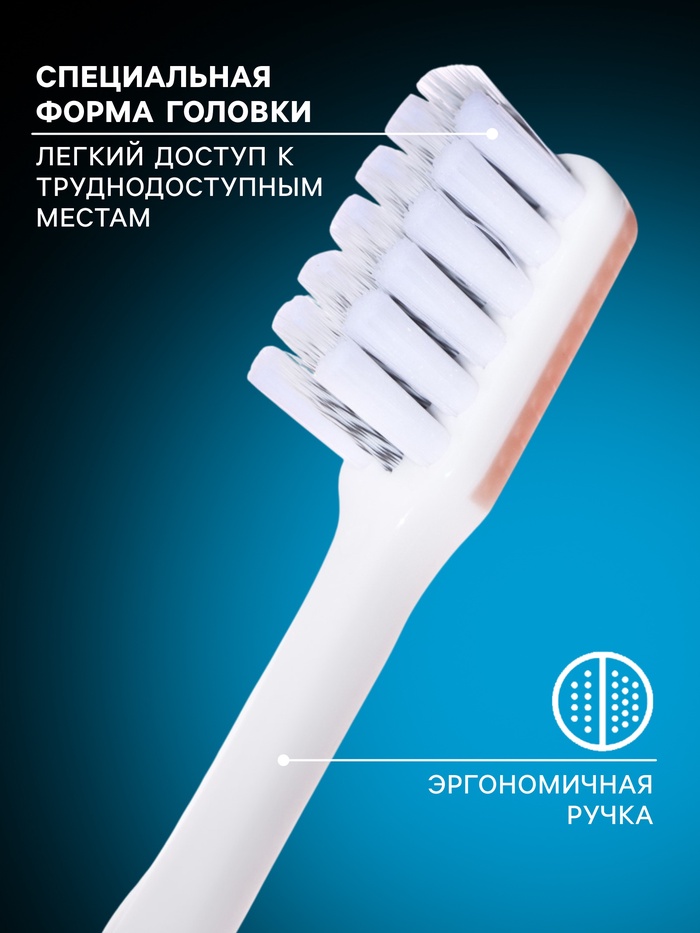 Разноуровневые щетинки позволяют эффективно удалять налет и остатки пищи из межзубных промежутков.