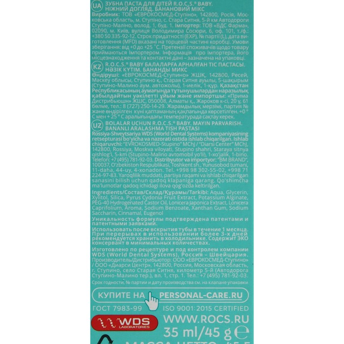 Зубная паста R.O.C.S. Baby, нежный уход, банановый микс, для малышей 0-3 лет, 45 г