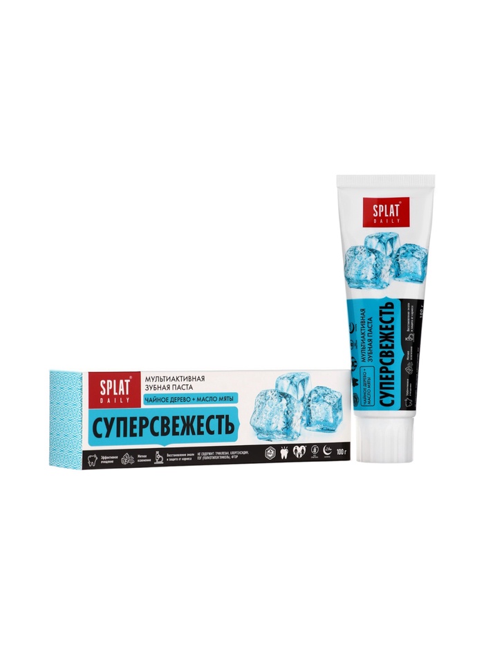 Входящие в состав зубной пасты SPLAT DAILY SUPER FRESH эфирное масло чайного дерева и лактат кальция оказывают реминерализирующее и противокариесное действие.