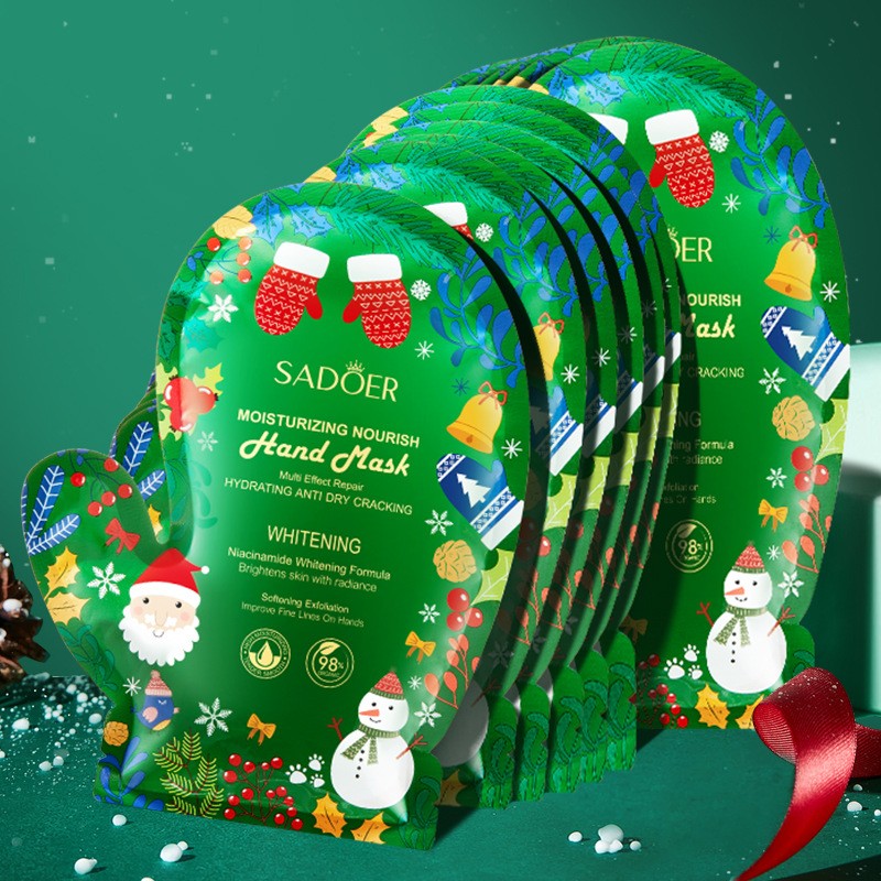 Новогодняя многофункциональная, увлажняющая, питательная и отбеливающая маска для рук на тканевой основе в форме варежки предназначена для глубокого увлажнения, смягчения, осветления, восстановления поврежденной, огрубевшей, обветренной кожи рук.