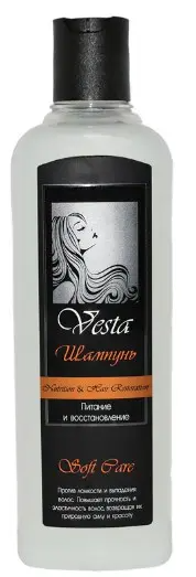 Шампунь Vesta SOFT CARE "Nutrition and hair restoration" обеспечивает надежную защиту, питание и восстановление структуры поврежденных волос, способствует улучшению их состояния после окрашивания, механического или температурного воздействия. Укрепляется структура волос, они становятся блестящими, упругими, имеют здоровый ухоженный вид. Подходит для всех типов волос и ежедневного использования. Природная очищенная вода, сульфоэтоксилат натрия, кокоамидопропил бетаина, диэтаноламин, хлорид натрия, кокоглюкозид глицериолеат, гидролизованное касторовое масло, D-пантенол, гидролизованный протеин пшеницы, стеарин акрилат сополимер, гидролизованный протеин пшеницы, дисодиум кокоамфродиацетат, линоумамидолпропил ПГ димодиум хлорид фосфат диметикон, отдушка парфюмерная, лимонная кислота, динатриевая соль ЭТДК, пропилпарабен, краситель.