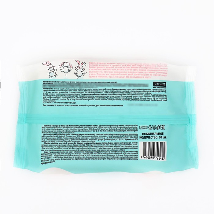Влажные полотенца детские, универсальные, 60 шт.