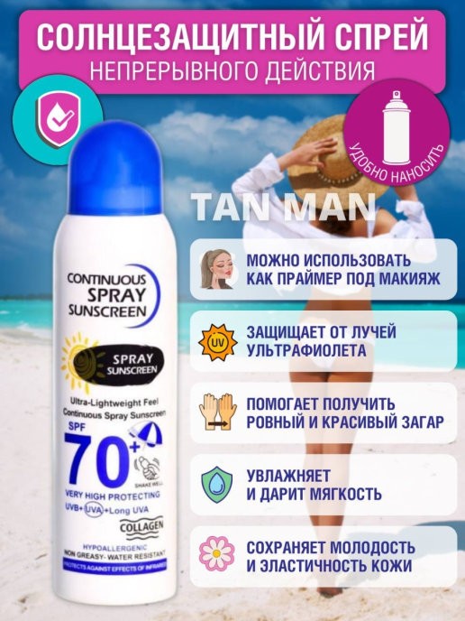 Солнцезащитный Спрей  Водостойкий 70+ UVA / UVB  НЕПРЕРЫВНОГО ДЕЙСТВИЯ