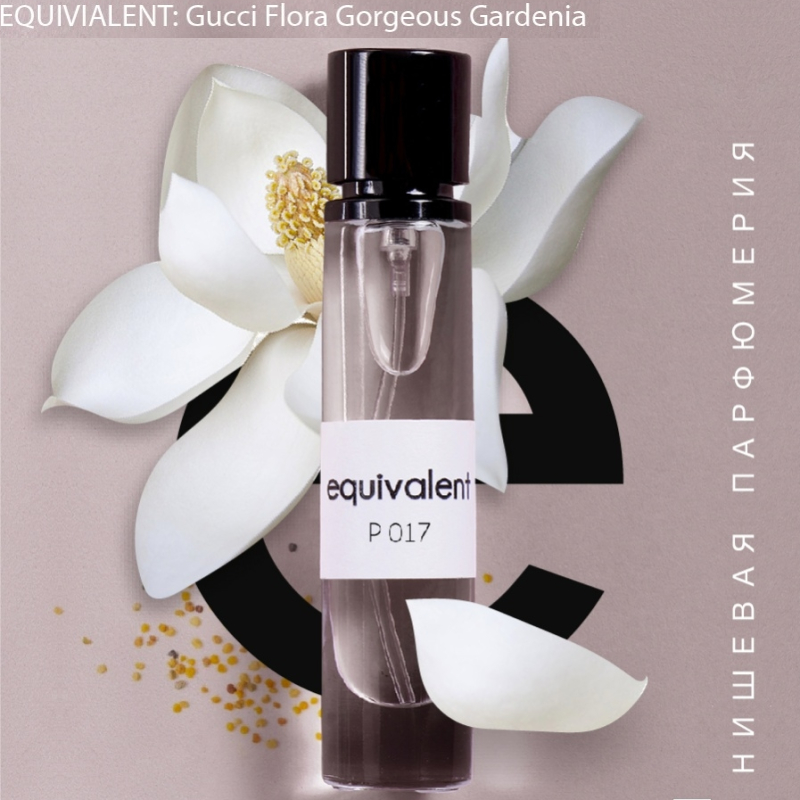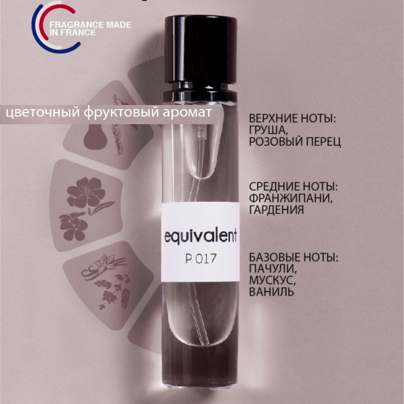 "EQUIVALENT" P017 - аромат нежности, женственности, изящности. Это глубокая, утонченная, обволакивающая парфюмерная композиция, в которой свежесть, сочность и сладость груши и ягод переплетаются с изысканным звучанием гардении и франжипани на благородном древесном фоне. Основные ноты: груша, красные ягоды, гардения, франжипани, пачули.
