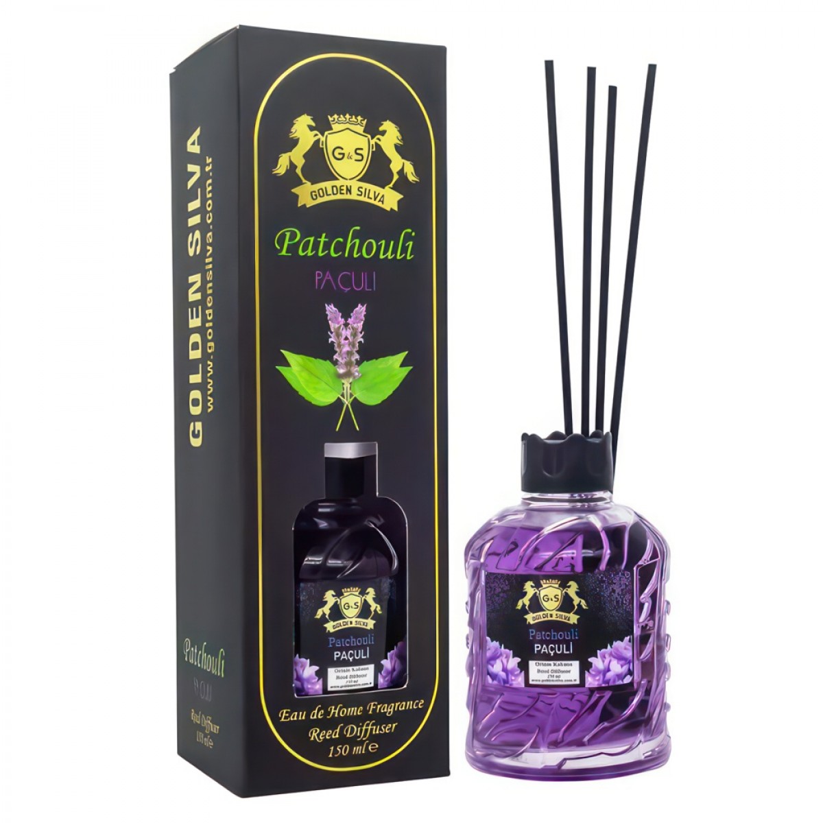 Диффузор Golden Silva Patchouli, 150 ml – парфюмерный диффузор, это флакон с ароматической жидкостью и натуральными, бамбуковыми палочкам, которые источают благовония. Приятный аромат в комнате, создает приятную, положительную атмосферу и благотворно влияет на ваше настроение и самочувствие. Запах диффузора бывает разнообразным: пряным, цветочным, фруктовым или свежим. Диффузор со стойким и мягким ароматом листьев пачули, это один из самых популярных и сложных букетов из пряностей, свежих трав и земли. В состав парфюмерной композиции входят натуральные эфирные масла, которые помогают улучшить самочувствие, сон и уничтожить неприятные запахи.