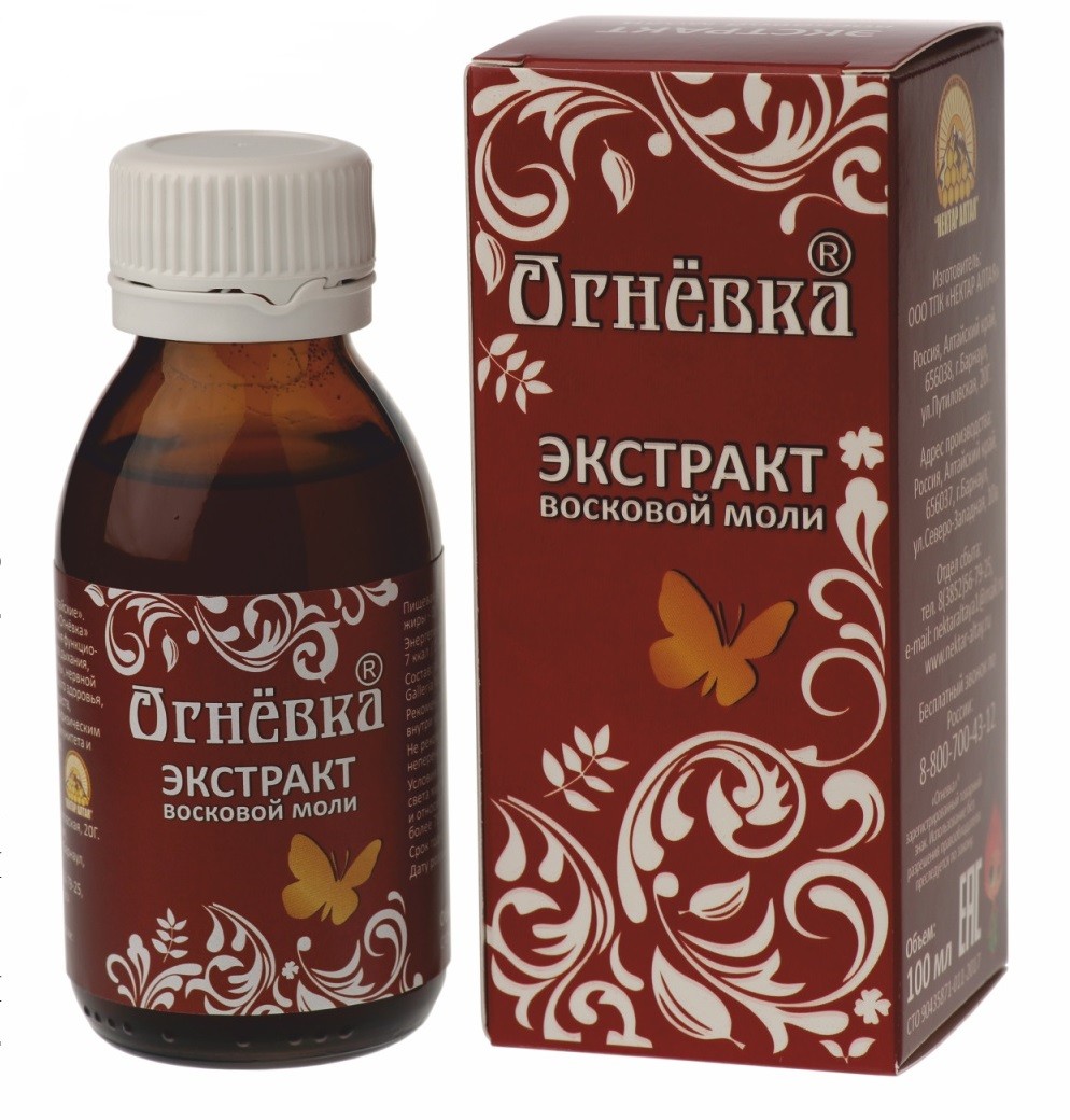 Экстракт восковой моли ТМ "Огневка", жидкий, флакон из темого стекла, крышка с контролем первого вскрытия. Состав: экстракт восковой моли Galleria Melonella 20%, нефильтрованный. Обладает мощным оздоровительным эффектом, активизирует иммунную систему человека, оказывает комплексное биостимулирующее и омолаживающее воздействие на организм человека. Применяется: -При бронхо-легочных заболеваниях, в т.ч. ангине, бронхиальной астме, бронхите, воспалении легких, плеврите, трахеите, туберкулезе легких и др. органов; -При сердечно-сосудистых заболеваниях, гипертонии, вегетососудистой дистонии, атеросклерозе как сосудов головного мозга так и нижних конечностей, тромбофлебите, варикозе; -При нарушении обмена веществ; -При различных заболеваниях женской и мужской мочеполовой системы (бесплодие, климактерические расстройства, простатит, аденома простаты, импотенция, снижение полового влечения и т.д.); -В периоды высоких физических и психоэмоциональных нагрузок (занятиях спортом, тяжелым физическим трудом, экзаменах и т.д.), при физической астении, неврозах, депрессии; -В качестве профилактического, общеукрепляющего, повышающего иммунитет средства, в послеоперационный и восстановительный период. Способ применения: 0,5 чайной ложки экстракта растворить в небольшом количестве жидкости (вода или сок комнатной температуры), принимать внутрь за 20-30 минут до еды, но не позднее, чем за 3-4 часа до сна. - Для профилактики - 1-2 раза в день. - При лечении - 2-3 раза в день. Дозировку можно увеличить или уменьшить, индивидуально, смотреть по состоянию! Минимальный курс 3 месяца. Устойчивый результат достигается при регулярном приеме в течении года - полутора лет. Принимать следует курсами по 3 месяца, с перерывами в 14-21 день. Не рекомендуется при индивидуальной непереносимости компонентов. Срок хранения 24 месяца.