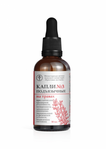 Питьевые подъязычные капли №3 изготовлены на основе кавказских целебных трав и рекомендованы при заниженной самооценке, неуверенности и подавленном состоянии. Продукт может уменьшать эмоциональную и физическую усталость, улучшая настроение, повышая мотивацию, придавая ощущение бодрости. Растительные экстракты в составе также применяются при слабоволии, уступчивости, так как ценятся за способность повышать чувство самоуважения, возвращать волю к жизни, счастье и радость бытия, придают силы постоять за себя.