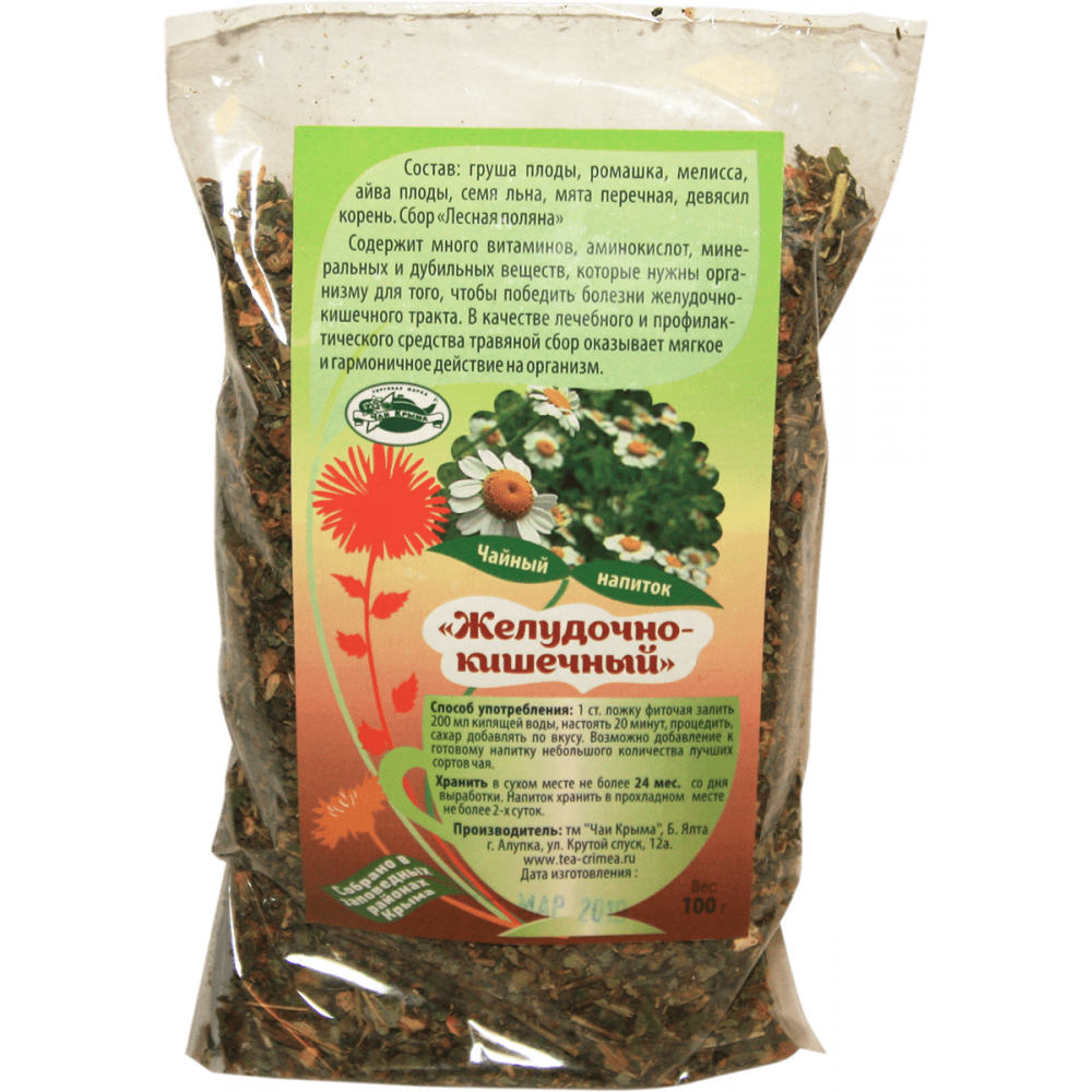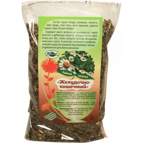 Чайный напиток «Желудочно-кишечный» содержит много витаминов, аминокислот, минеральных и дубильных веществ, которые нужны организму для того, чтобы победить болезни желудочно-кишечного тракта. В качестве лечебного и профилактического средства травяной сбор оказывает мягкое и гармоничное действие на организм. Состав: груша плоды, ромашка, мелисса, айва плоды, семя льна, мята перечная, девясил корень. Способ употребления: 1 ст. ложку фиточая залить 200 мл кипящей воды, настоять 20 минут, процедить, сахар добавлять по вкусу. Возможно добавление к напитку лучших сортов чая.
