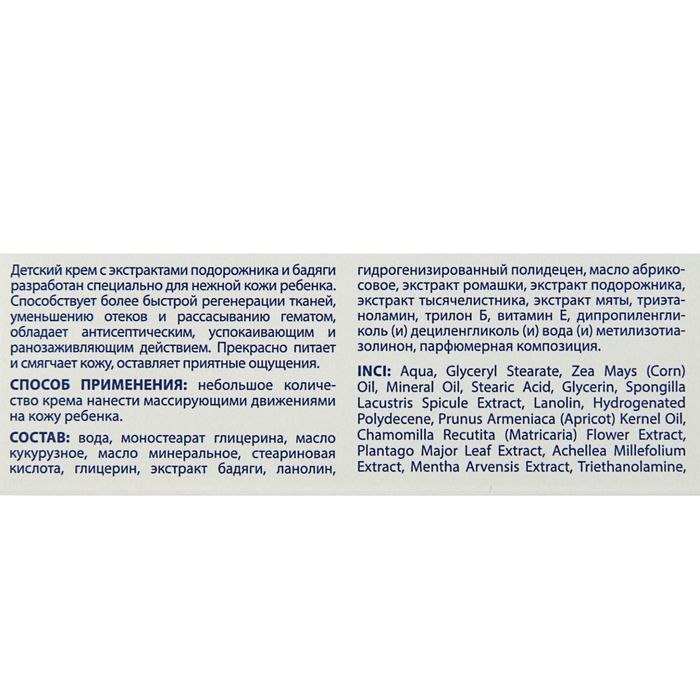 Детский крем с экстрактами подорожника и бадяги разработан специально для нежной кожи ребёнка. Средство ускоряет восстановление тканей, уменьшает отёки и устраняет гематомы. Обладает антисептическим, успокаивающим и ранозаживляющим действием. Питает и смягчает кожу.