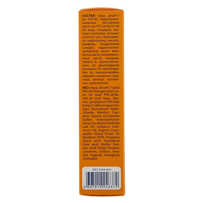 Состав: экстракты окопника и золотого уса, хондроитин, глюкозамин, ментол, камфора, масло гвоздики.