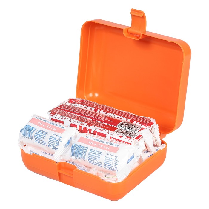 Комплектация: Перчатки нестерильные, Бинт нестерильный, Бинт стерильный, Футляр, Устройство для проведения искусств. дыхания, Ножницы, Лейкопластырь, Жгут