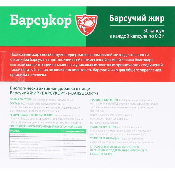 Барсучий жир Барсукор, 50 капсул по 0.2 г
