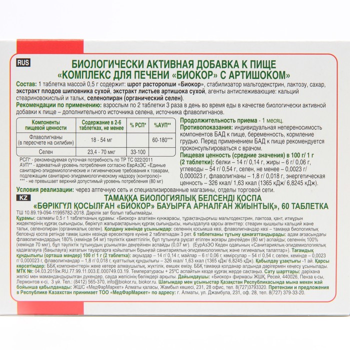 Состав, форма выпуска и упаковка: шрот расторопши "Биокор", экстракт плодов шиповника сухой, экстракт листьев артишока сухой, селен (селенопиран (9-фенил-симм-октагидроселеноксантен)), мальтодекстрин, сахар, лактоза, Е533iii, Е470.