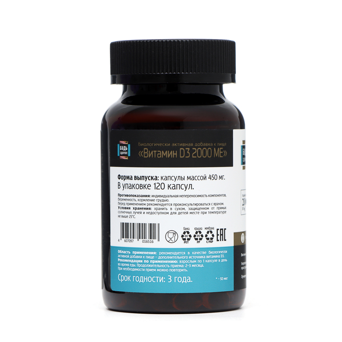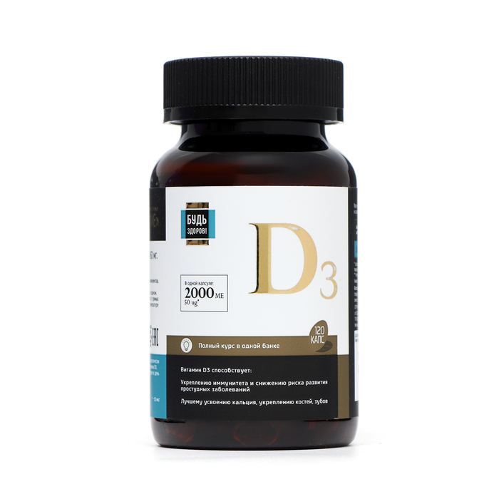 Витамин Д3 2000МЕ "Будь здоров!" - это витаминный препарат, который содержит витамин Д3. Он упакован в удобные капсулы, всего в упаковке 120 штук.