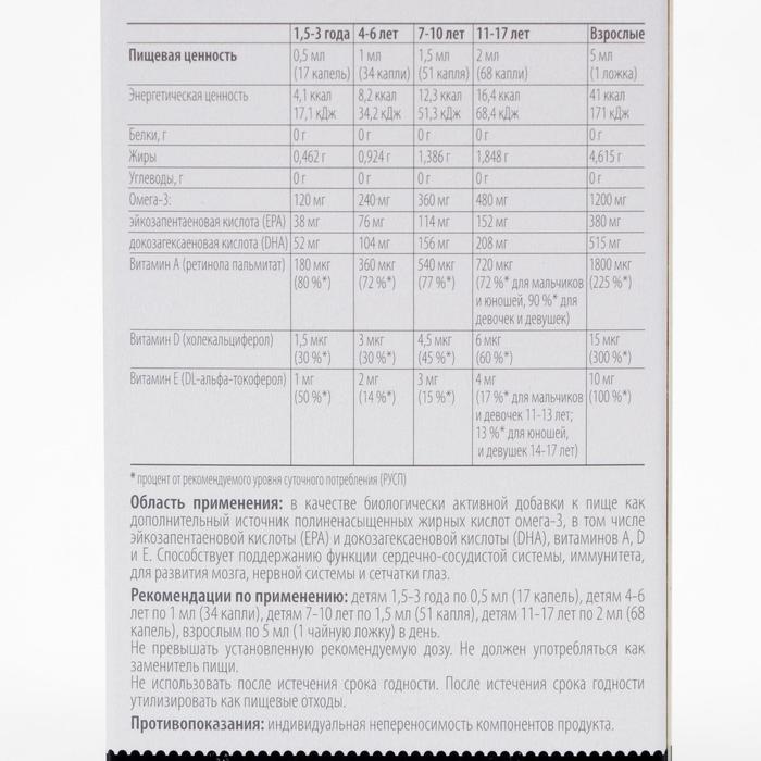 Состав: рыбий жир из печени трески - 98, 75 мл, где содержится Омега-3 - 24 г, в том числеэйкозапентаеновой кислоты (ЕРА) - 7,6 г и докозагексаеновой кислоты (DHA) - 10,3 г, DL-альфа-токоферол (витамин Е) - 200 мг, ретинола пальмитат (витамина А) - 33,23 мг, холькациферол (витамин D) - 0,234 мг.