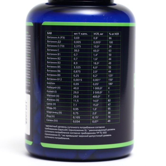 В одной капсуле (суточная доза) содержится: 12 жизненно необходимых витаминов.