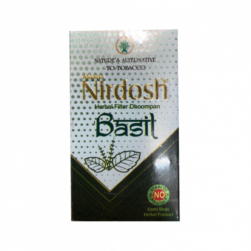 Сигареты без табака с базиликом Нирдош (Nirdosh) способствуют комфортному отказу от обычных сигарет. Обладает противовоспалительными свойствами, оказывают антибактериальное и дезинфицирующее действие, заживляют ранки и ссадинки в полости рта, восстанавливают поврежденные никотином слизистые оболочки. Способ применения: подожгите кончик сигареты, вдыхайте и выдыхайте дым как при курении обычных сигарет. Противопоказания: аллергия на составляющие компоненты, возраст до 18 лет, воспалительные заболевания верхних дыхательных путей, сердечная недостаточность, беременность и лактация. Состав: измельченные листья базилика, мелиссы, сныти, тенду, калгана., эвкалипта, сушеная хурма, порошок корицы и гвоздики, тмин.
