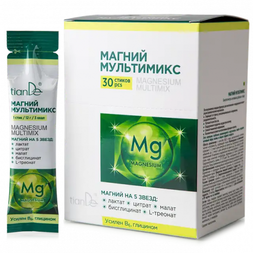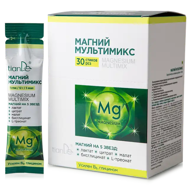 «Магний мультимикс» от корпорации TianDe оптимально сочетает в себе сразу пять видов магния (лактат, цитрат, малат, бисглицинат, L-треонат), в том числе в биодоступной хелатной форме, обеспечивая эффективную поддержку организма. Мультисостав, усиленный витамином В6 и глицином: