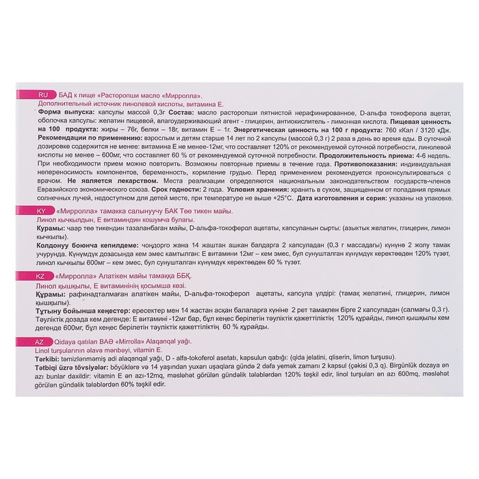Масло расторопши Mirrolla, 100 капсул по 0.3 г