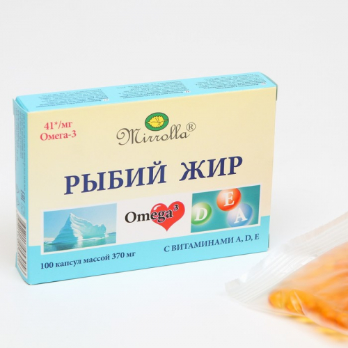 Рыбий жир Mirrolla с витаминами A, D, E, 100 капсул по 0.37 г