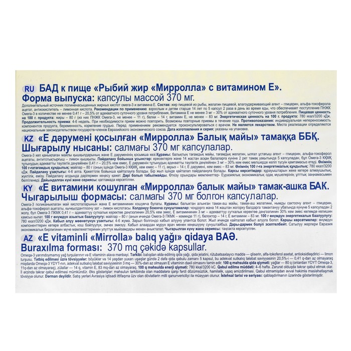 Рыбий жир Mirrolla с витамином E, 100 капсул по 0.37 г