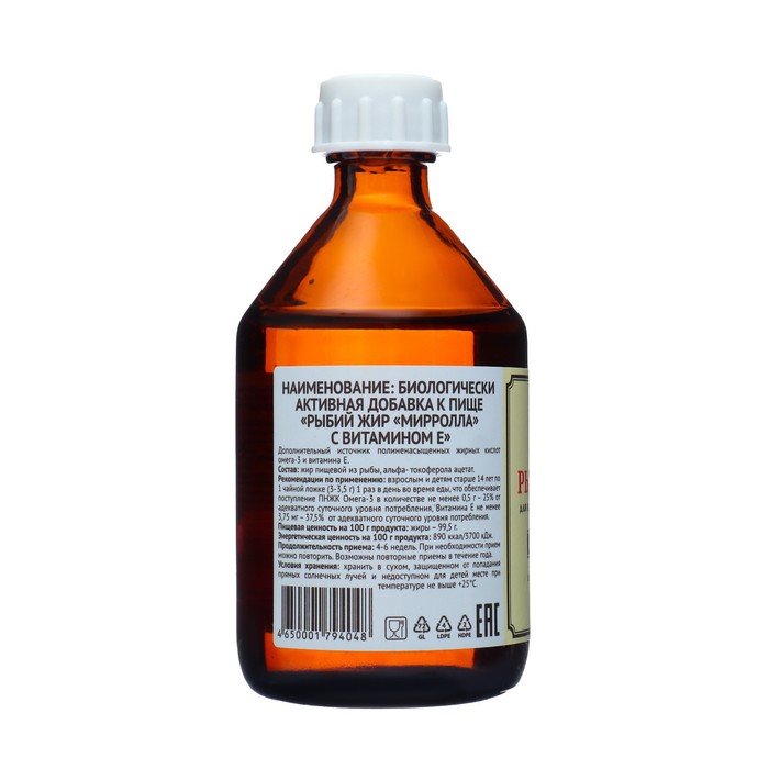 Рыбий жир «Мирролла», производимый из жира норвежского лосося, является источником омега-3 кислот (в том числе эйкозапентаеновой и докозагексаеновой кислоты) и отвечает европейскому стандарту качества и безопасности.